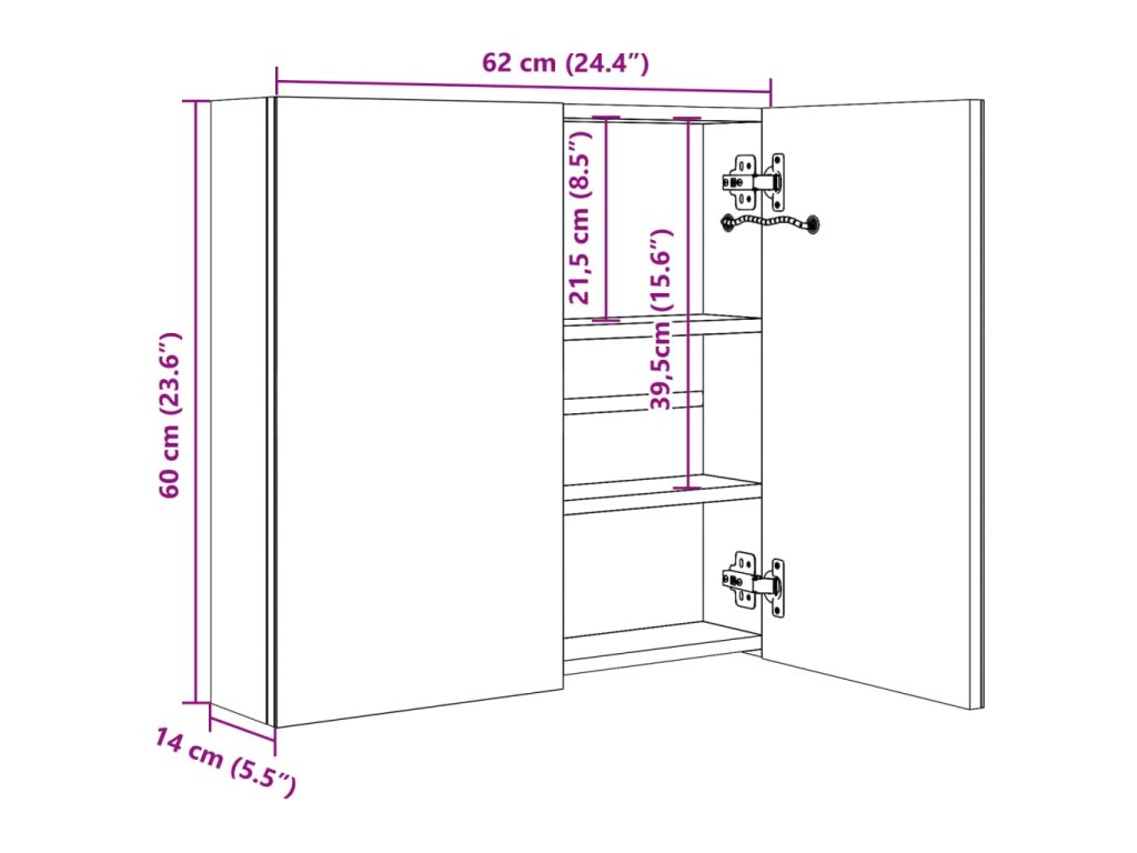 Je vyrobená z kvalitnej MDF dosky s melamínovým povrchom, čo zaručuje dlhodobé použitie. Vďaka dvom energeticky účinným LED pásikom sa budete vidieť v tom najlepšom svetle pri nanášaní make-upu, česaní a starostlivosti o pleť. Osvetlí tak nielen vašu izbu, tvár, ale aj úsmev. Vnútri sa nachádzajú 3 police, ktoré poskytujú dostatok úložného miesta na všetky toaletné potreby a kozmetiku. Pomocou spodného tlačidla môžete svetlo ľahko zapínať a vypínať. Táto štýlová a funkčná skrinka dodá vašej izbe originálny dizajn!