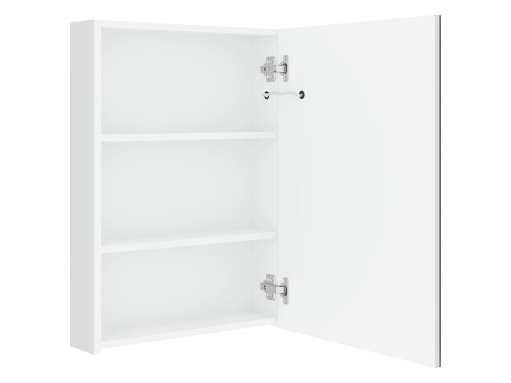 Je vyrobená z kvalitnej MDF dosky s melamínovým povrchom, čo zaručuje dlhodobé použitie. Vďaka dvom energeticky účinným LED pásikom sa budete vidieť v tom najlepšom svetle pri nanášaní make-upu, česaní a starostlivosti o pleť. Osvetlí tak nielen vašu izbu, tvár, ale aj úsmev. Vnútri sa nachádzajú 3 police, ktoré poskytujú dostatok úložného miesta na všetky toaletné potreby a kozmetiku. Pomocou spodného tlačidla môžete svetlo ľahko zapínať a vypínať. Táto štýlová a funkčná skrinka dodá vašej izbe originálny dizajn!