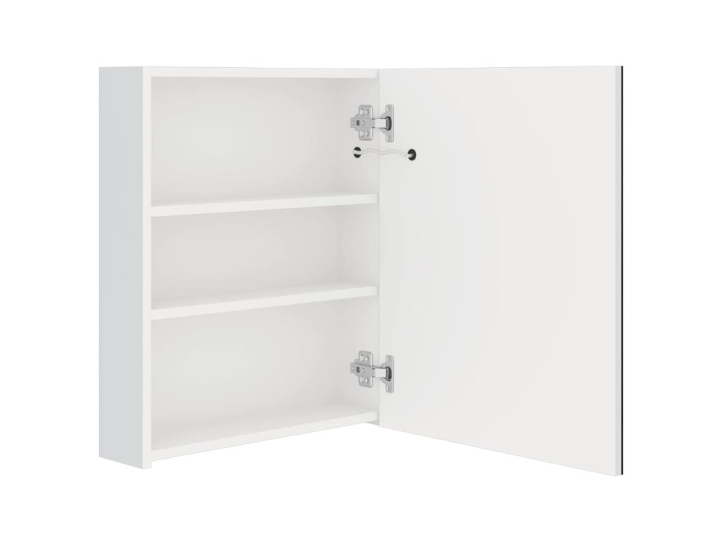 Táto nástenná skrinka je vyrobená z MDF dosky s melamínovým povrchom, čo zaručuje dlhodobé použitie. Vďaka dvojitému energeticky účinnému LED pásiku sa budete vidieť v tom najlepšom svetle pri nanášaní make-upu, česaní a starostlivosti o pleť. Osvetlí tak nielen vašu izbu, tvár, ale aj úsmev. Vnútri sa nachádzajú 3 police, ktoré poskytujú dostatok úložného miesta na všetky toaletné potreby a kozmetiku. Pomocou spodného tlačidla môžete svetlo ľahko zapínať a vypínať. Táto štýlová a funkčná skrinka dodá vašej izbe originálny dizajn!