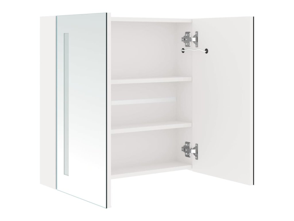 Je vyrobená z kvalitnej MDF dosky s melamínovým povrchom, čo zaručuje dlhodobé použitie. Vďaka dvom energeticky účinným LED pásikom sa budete vidieť v tom najlepšom svetle pri nanášaní make-upu, česaní a starostlivosti o pleť. Osvetlí tak nielen vašu izbu, tvár, ale aj úsmev. Vnútri sa nachádzajú 3 police, ktoré poskytujú dostatok úložného miesta na všetky toaletné potreby a kozmetiku. Pomocou spodného tlačidla môžete svetlo ľahko zapínať a vypínať. Táto štýlová a funkčná skrinka dodá vašej izbe originálny dizajn!