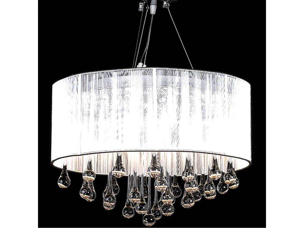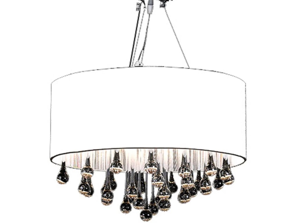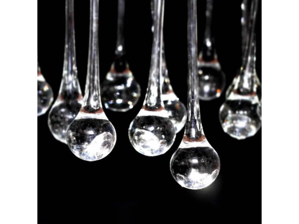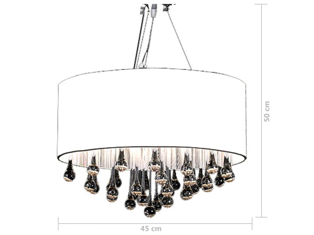 Luster má pochrómovaný kovový plášť s tienidlom z priesvitnej bielej priadze. Štýlové závesné svietidlo má dizajn v štýle kráľovských krištáľových lustrov. Vysokokvalitné bezfarebné sklo je číre a keď je osvetlené (aj z iných zdrojov svetla), krásne sa rozžiari a vytvára úžasnú hru farieb celého spektra.