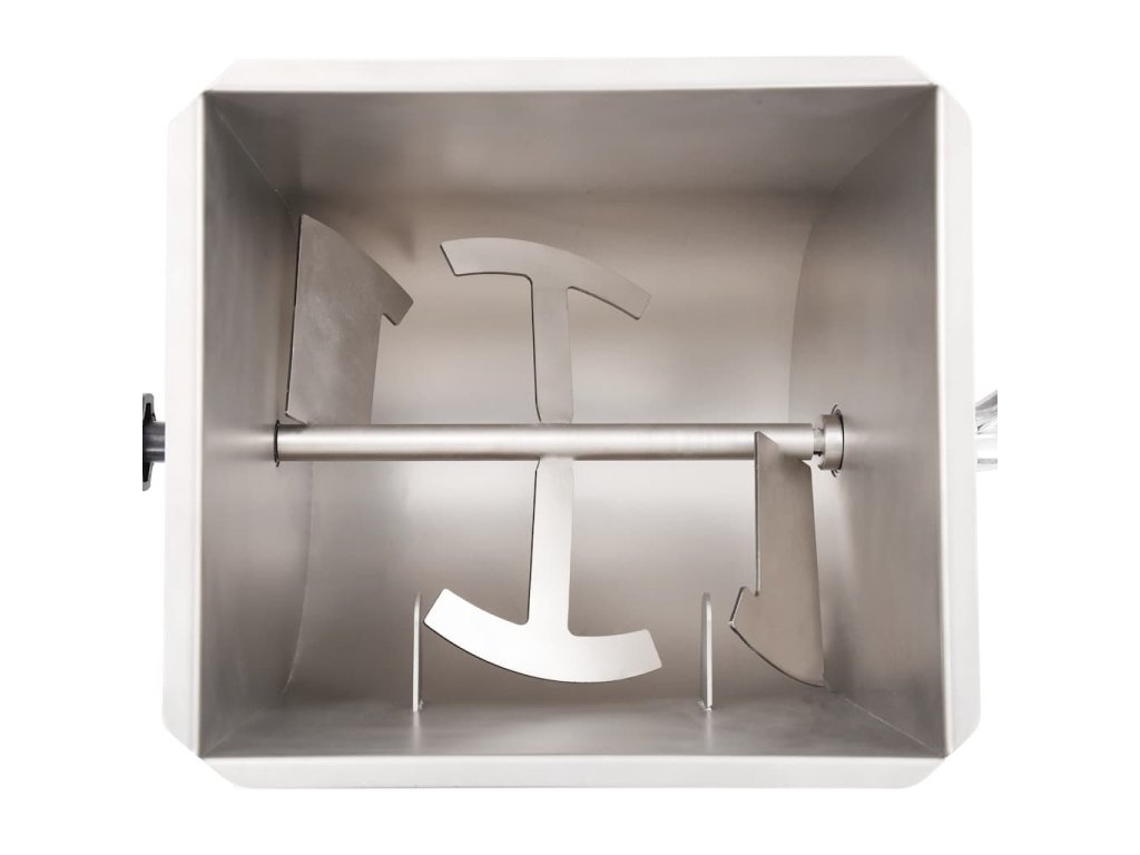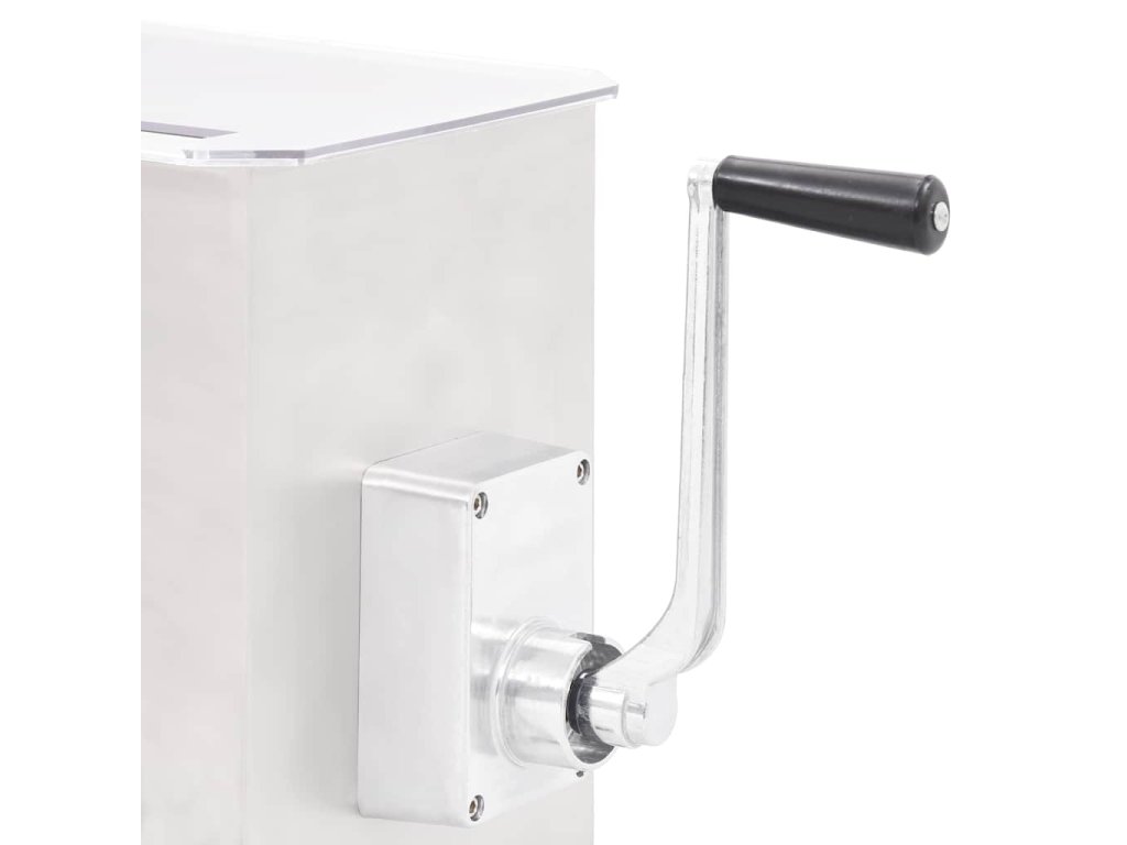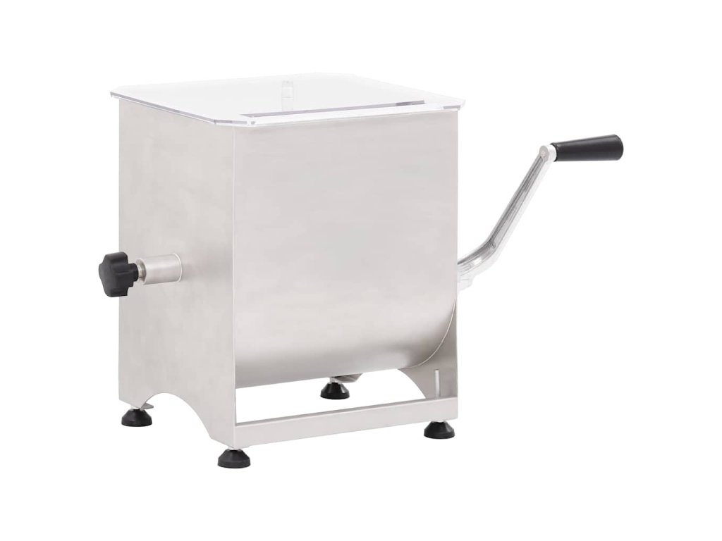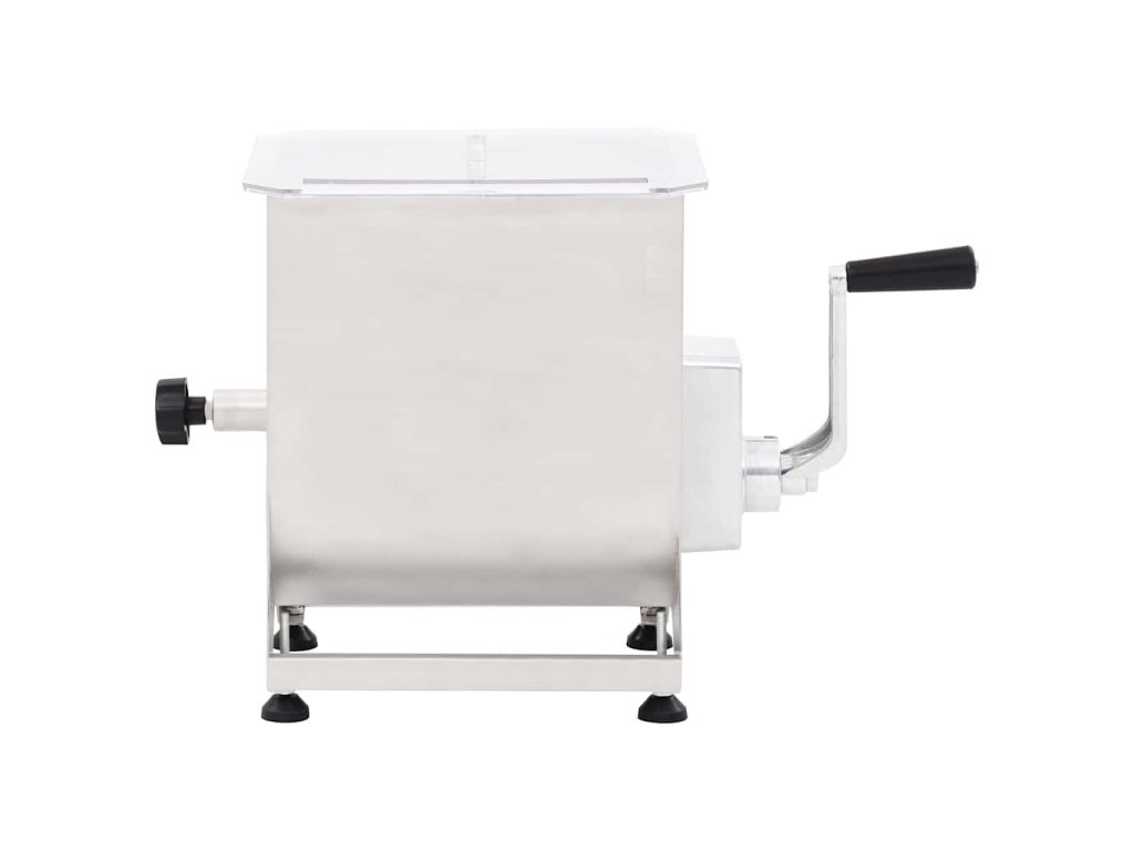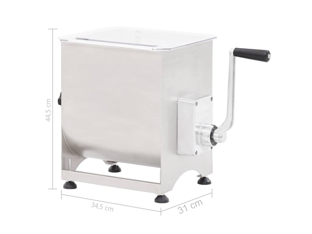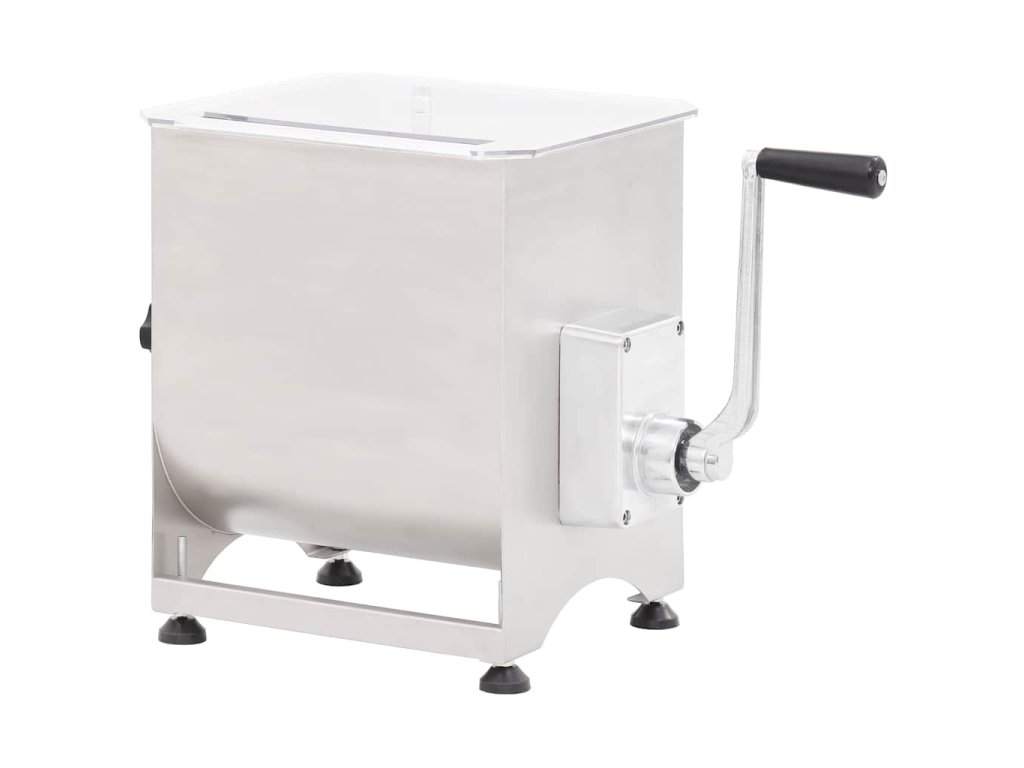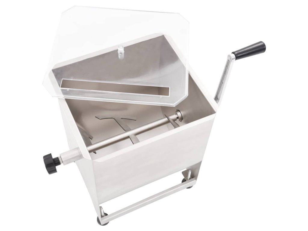 Táto výkonná miešačka mäsa s kapacitou až 20 kg mäsa je vybavená hriadeľom s lopatkami, ktoré mäso premiešavajú smerom dovnútra, aby koreniny rovnomerne a dôkladne prestúpili do vašej mäsovej zmesi. Dlhá kľuka s rukoväťou a priehľadné plastové veko vám umožňujú sledovať ako sa mäso mieša a udržia vaše ruky čisté a mimo dosahu čepelí. Miešačka na mäso je vyrobená z potravinárskej ocele a má veľmi pevnú a odolnú konštrukciu.