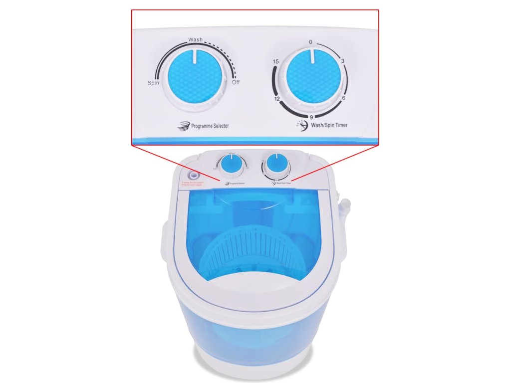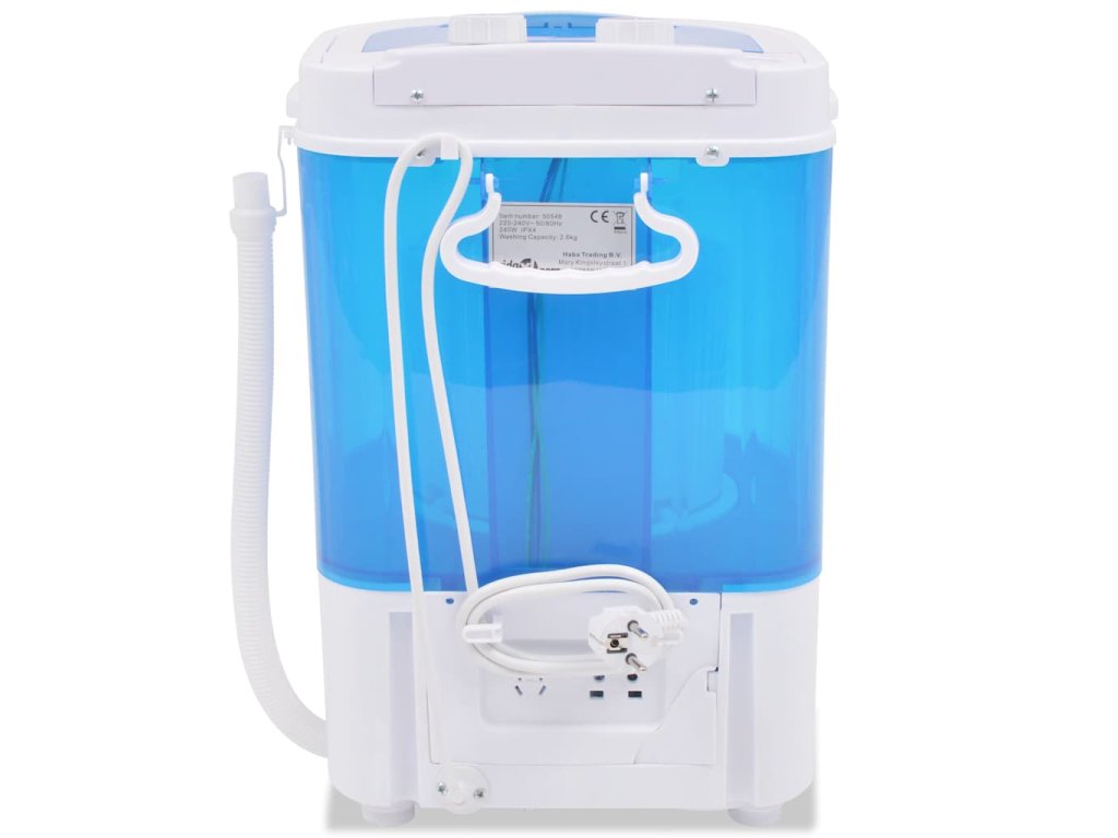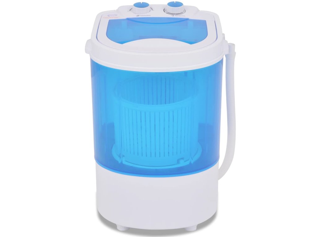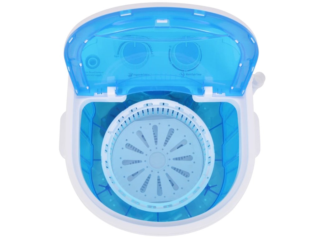 Objem tejto práčky je 2,6 kg a objem odstreďovania 2,6 kg. Vstavaný 15-minútový časovač automaticky vypne zariadenie po každom praní a odstreďovaní. Vďaka rukoväti môžete práčku pohodlne prenášať. Je ideálna na použitie pri cestovaní alebo kempovaní.