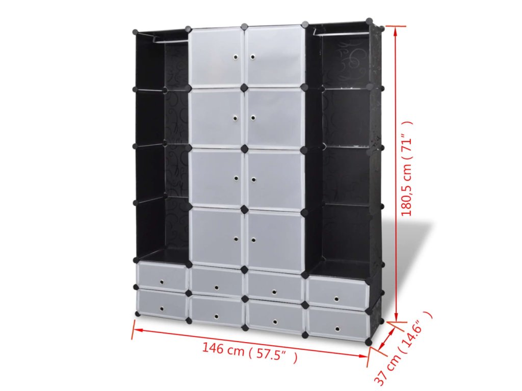 - 18priečinkov: 16 zatvorených priečinkov + 2 otvorené priečinky na vešiaky