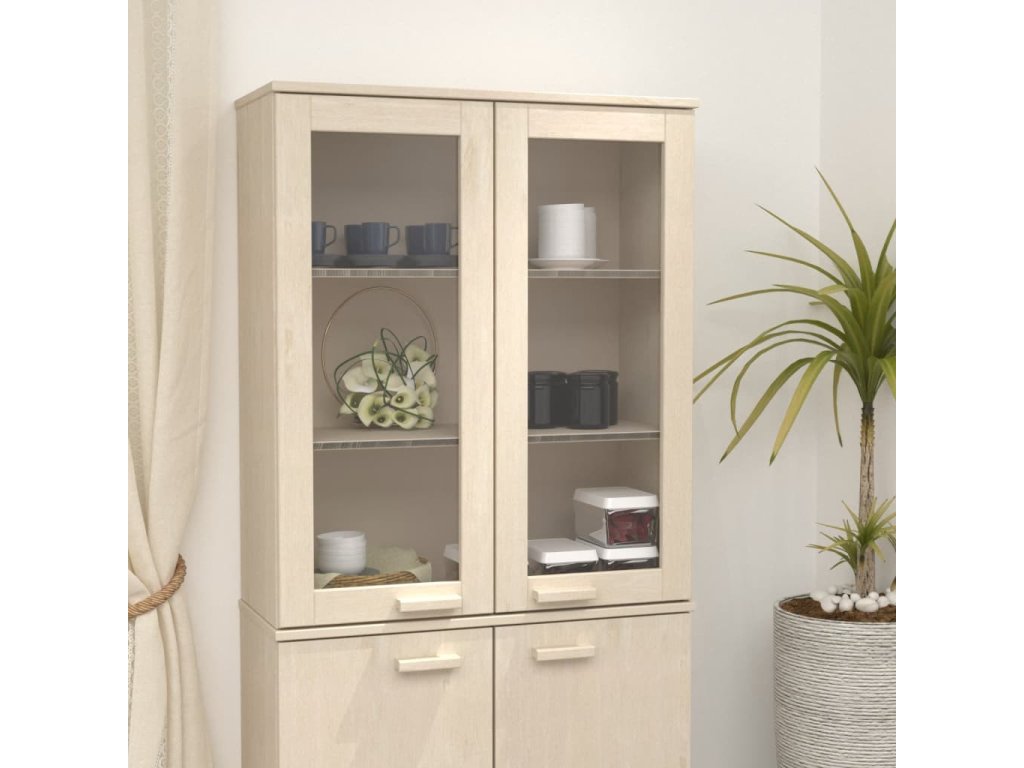 Je vyrobená z masívneho borovicového dreva, vďaka čomu je stabilná a pevná. Má tri stabilné police, na ktoré môžete umiestniť poháre, rámiky na fotografie alebo iné predmety, ktoré chcete mať na dosah. Sklenené dvierka zároveň zabránia vniknutiu prachu. Vrchná časť skrinky bude skvelou voľbou na vytvorenie ďalšieho úložného priestoru.