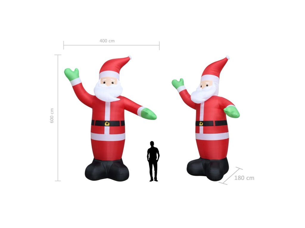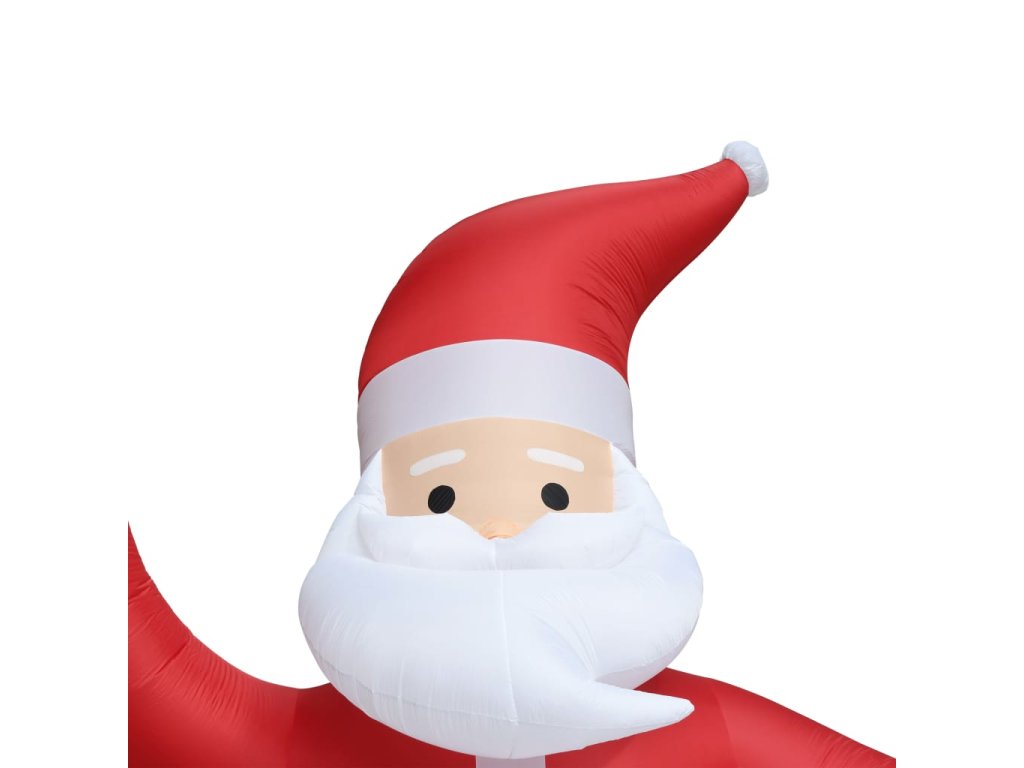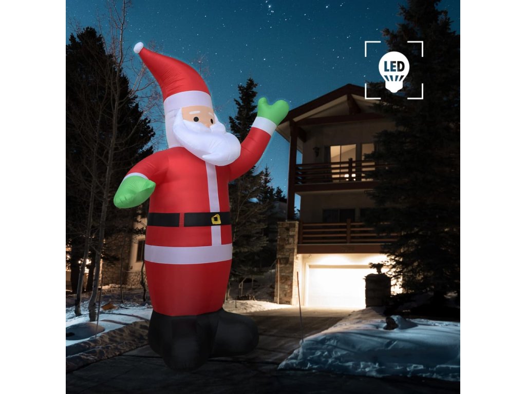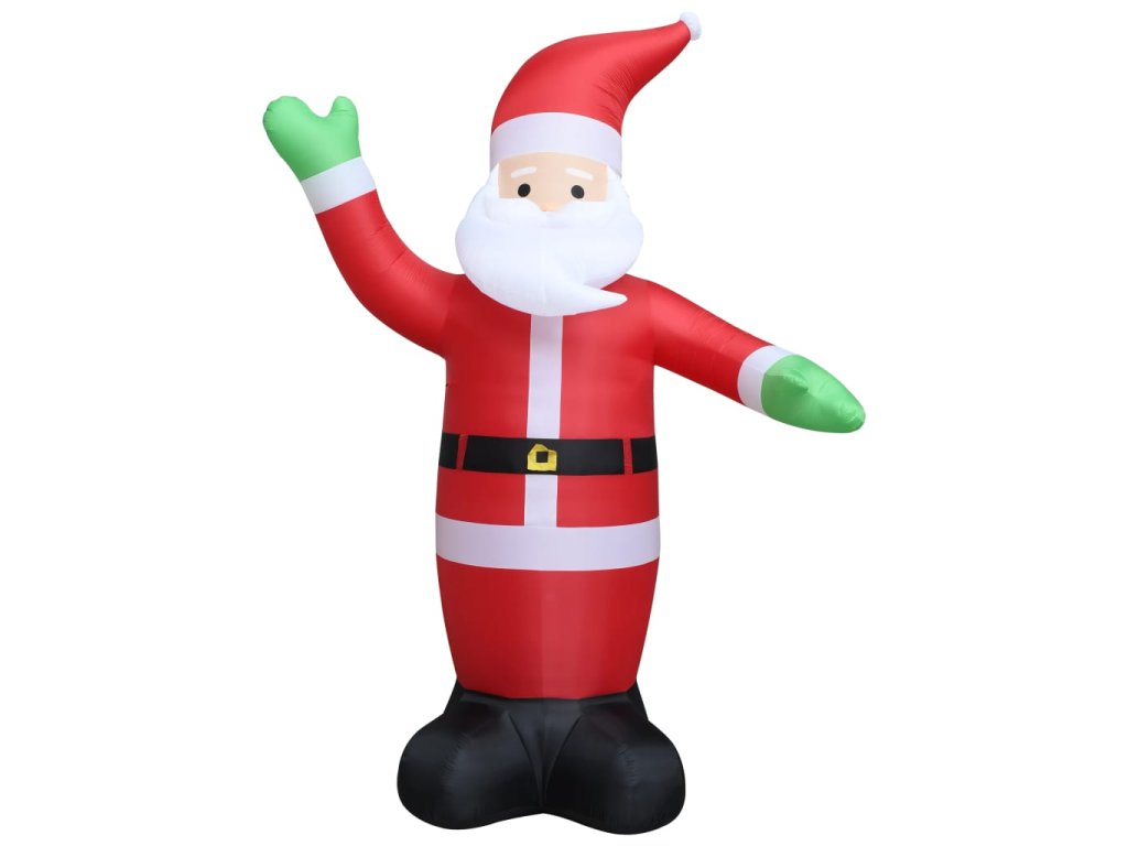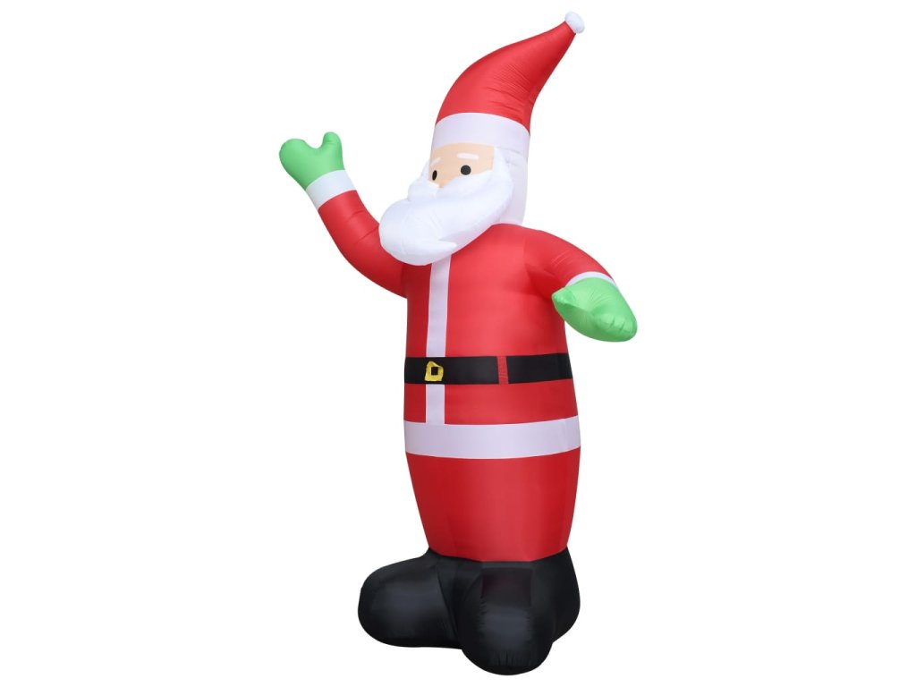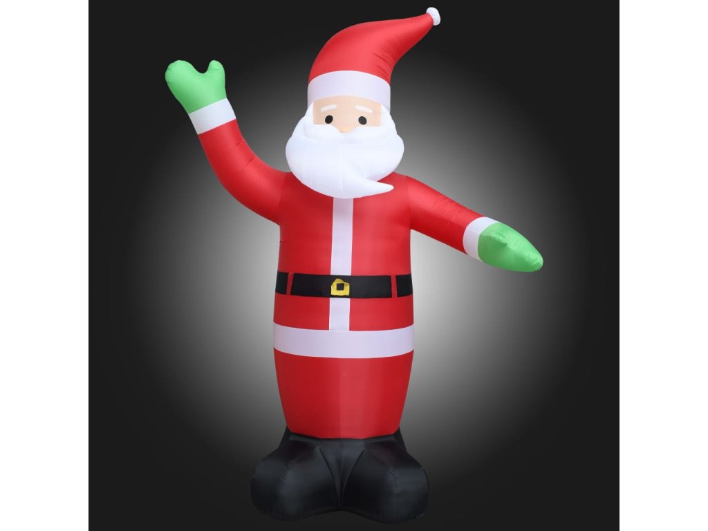 Tento obrovský vianočný mávajúci Santa Claus bude určite pôsobivým doplnkom k vašim vonkajším vianočným dekoráciám. Tento nafukovací Santa je vyrobený z kvalitnej polyesterovej tkaniny a je ľahký, odolný voči poveternostným vplyvom, vodeodolný a trvácny. Santa sa sám nafúkne za pár sekúnd. V nafukovacej jednotke sú zabudované 2 dúchadlá na udržanie dostatku vzduchu v produkte. Táto dekorácia sa dá po vypustení ľahko uložiť na ďalšiu sviatočnú sezónu. Táto vianočná dekorácia je vybavená 6 vysokovýkonnými LED diódami, ktoré vyžarujú jasné svetlo, a je energeticky veľmi efektívna. Uzemňovacie kolíky a laná na uchytenie Santa Clausa sú súčasťou balenia.