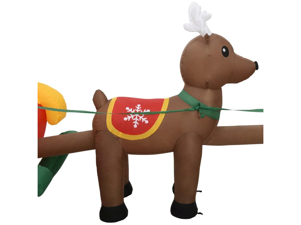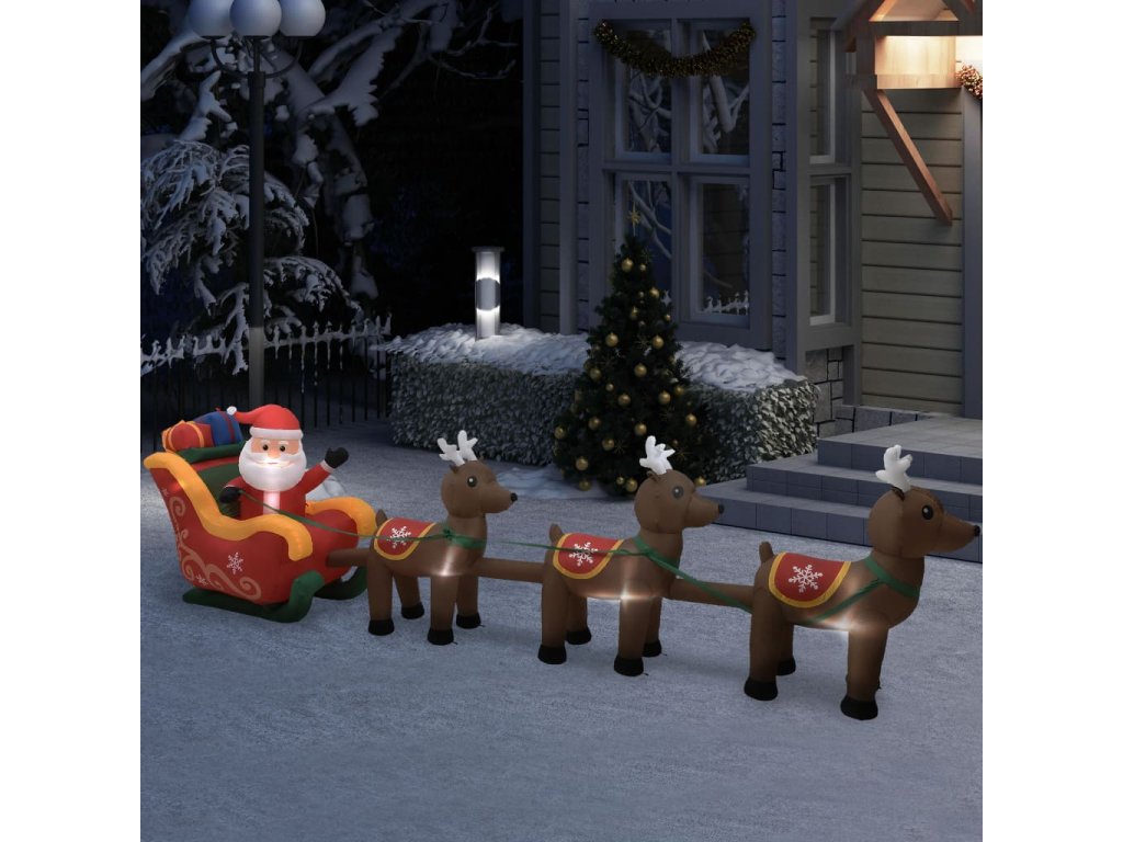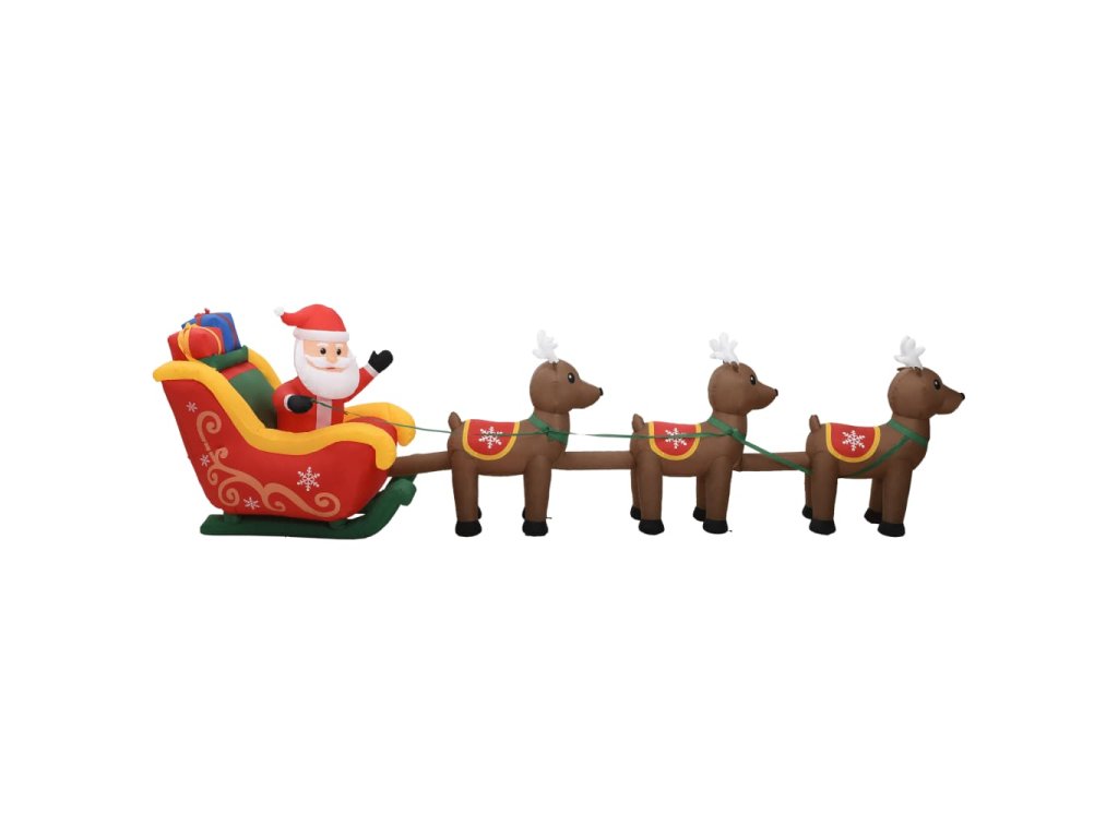 Tento nafukovací Santa je vyrobený z látky. Je ľahký, odolný voči poveternostným vplyvom, vodotesný a trvácny. Táto dekorácia obsahuje Santu a troch sobov. Dá sa nafúknuť za pár sekúnd, čo je veľmi praktické. Balenie obsahuje aj integrované dúchadlo, ktoré udržuje vzduch vo vnútri produktu. Dekoráciu môžete po vyfúknutí uložiť na ďalšie Vianoce. Táto vianočná dekorácia je vybavená 5 LED diódami, ktoré vyžarujú jasné svetlo a je energeticky úsporná. V balení sa nachádzajú aj kolíky a laná na pripevnenie.
