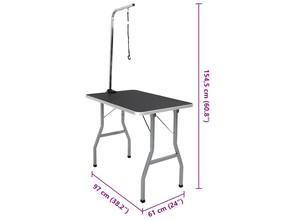 Tento stôl slúži na strihanie a úpravu domácich miláčikov. Je vhodný na použitie doma, no taktiež sa dá prenášať a použiť napríklad na psích výstavách, atď. Má protišmykový povrch, železný rám ošetrený práškovaním s nastaviteľným ramenom a slučkou.