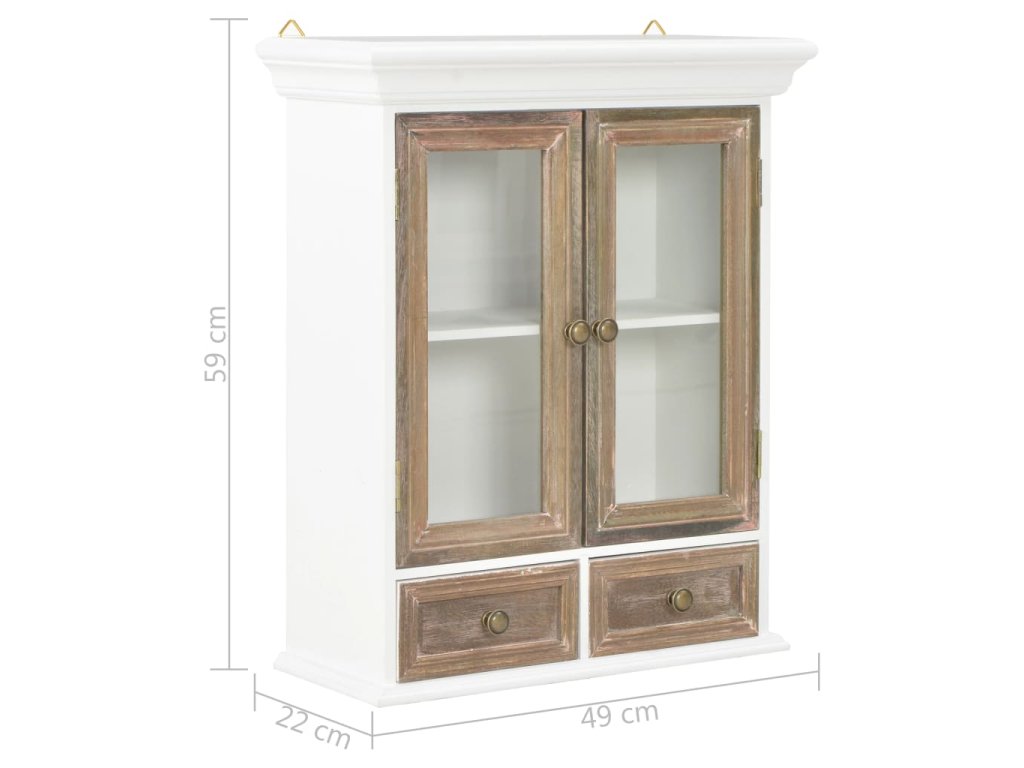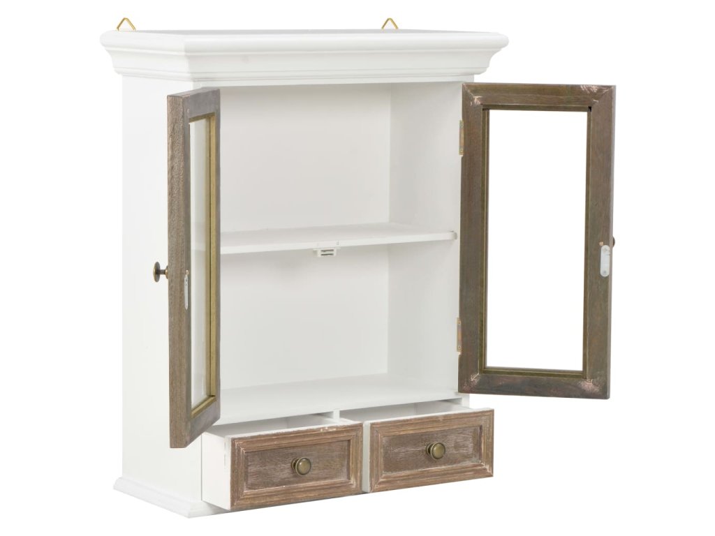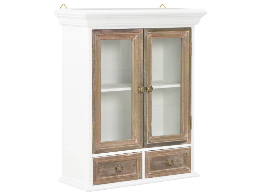Závesná skrinka vo vidieckom štýle je vyrobená z kompozitného dreva s povrchovou úpravou, ktorá jej dodáva rafinovaný vzhľad a vďaka ktorej sa dá ľahko očistiť navlhčenou handričkou. Nástenná skrinka má dve zásuvky, ktoré poskytujú ďalší úložný priestor, a dve dvierka z akrylu, ktoré sa dajú jednoducho otvoriť. Klasické úchytky úložnej skrinke dodávajú vintage štýl. Závesná skrinka má montážny systém, pomocou ktorého sa dá jednoducho upevniť na stenu. Výrobok sa jednoducho montuje.