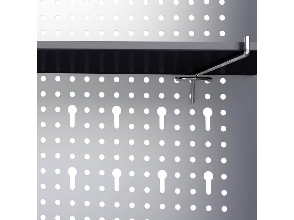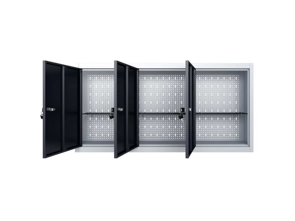 Táto skrinka na náradie obsahuje tri výškovo nastaviteľné police a perforovanú platňu s Euro otvormi, ktoré sa dajú použiť na zavesenie rôznych druhov nástrojov, ako sú kľúče, kliešte, kladivá atď. Skrinka na náradie, vybavená tromi uzamykateľnými dvierkami (súčasťou balenia sú 2 kľúče pre každé dvere), je mimoriadne bezpečná. Je vyrobená z kovu s extra silným náterom odolným voči poškriabaniu, vďaka čomu je odolná a dobre sa čistí. Tento produkt si vyžaduje montáž.