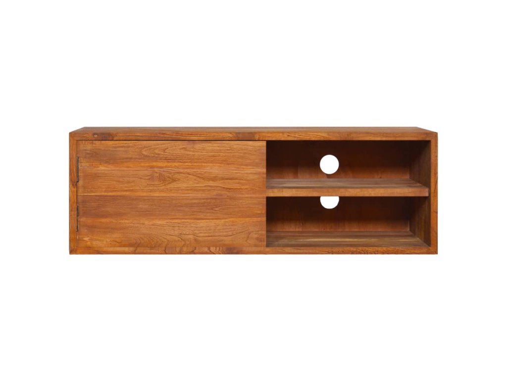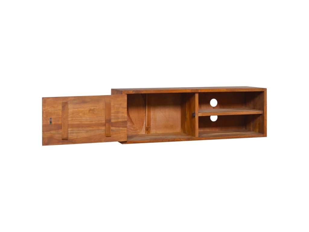 Hifi skrinka je vyrobená z tvrdého teakového dreva, ktoré bolo umelo vysušené a jeho povrch bol následne jemne obrúsený, aby získal hladký vzhľad. Teakové drevo sa vyznačuje výnimočnou pevnosťou, a tak predstavuje jeden z najvhodnejších materiálov na výrobu nábytku spomedzi všetkých ostatných druhov dreva. Ak si chcete zaobstarať nábytok, ktorý vám bude slúžiť dlhé roky, teakové drevo je pre vás ako stvorené. 2 zásuvky a 1 priečinok na tejto skrinky poskytujú dostatok úložného priestoru, aby boli vaše rôzne drobnosti prehľadne usporiadané. Môžete ju jednoducho zavesiť na stenu s dvierkami na ľavej alebo pravej strane podľa vašich preferencií pomocou dvoch prípojok. Táto veľká TV skrinka sa skladá z dvoch malých skriniek. Podľa vašich preferencií ich môžete skombinovať do skrinky s dĺžkou 180 cm alebo ich použiť samostatne.
