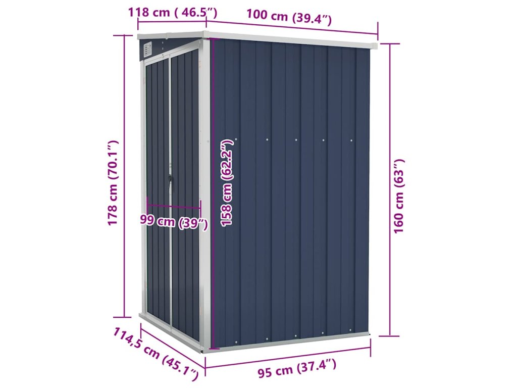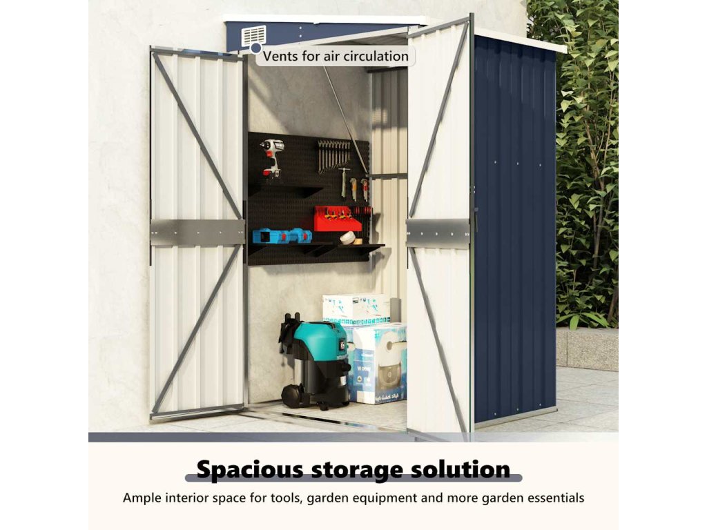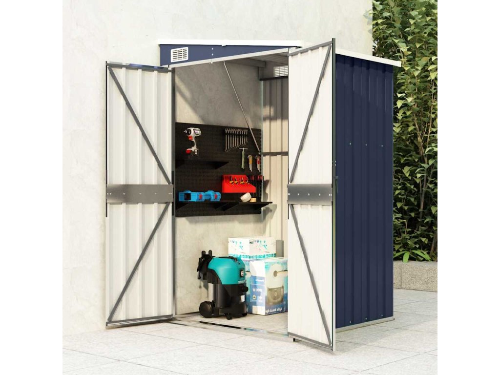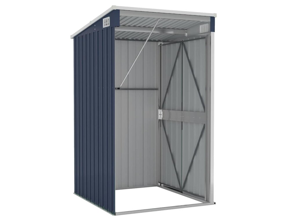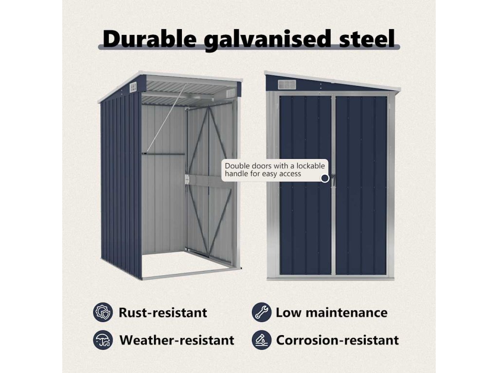Keďže je vyrobený z pozinkovanej ocele a kovu, skladovací domček vyžaduje minimálnu údržbu a je veľmi odolný. Dvojité otváracie dvere vpredu umožňujú jednoduchý vstup a výstup. Plastová rukoväť s funkciou zámku zaisťuje bezpečnosť vašich vecí. Okrem toho dažďová voda automaticky odteká zo strechy vďaka šikmej konštrukcii.