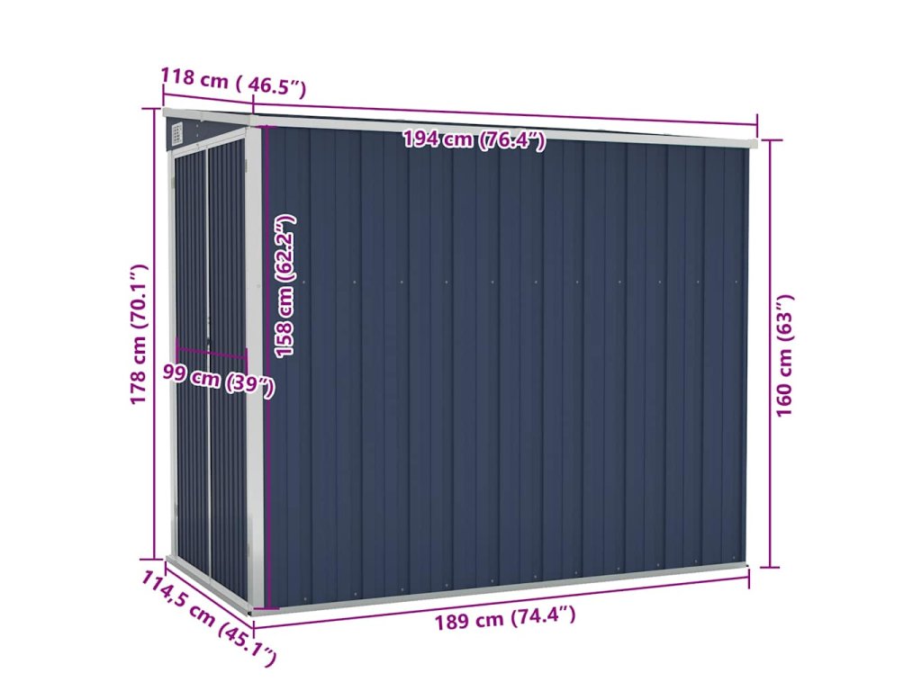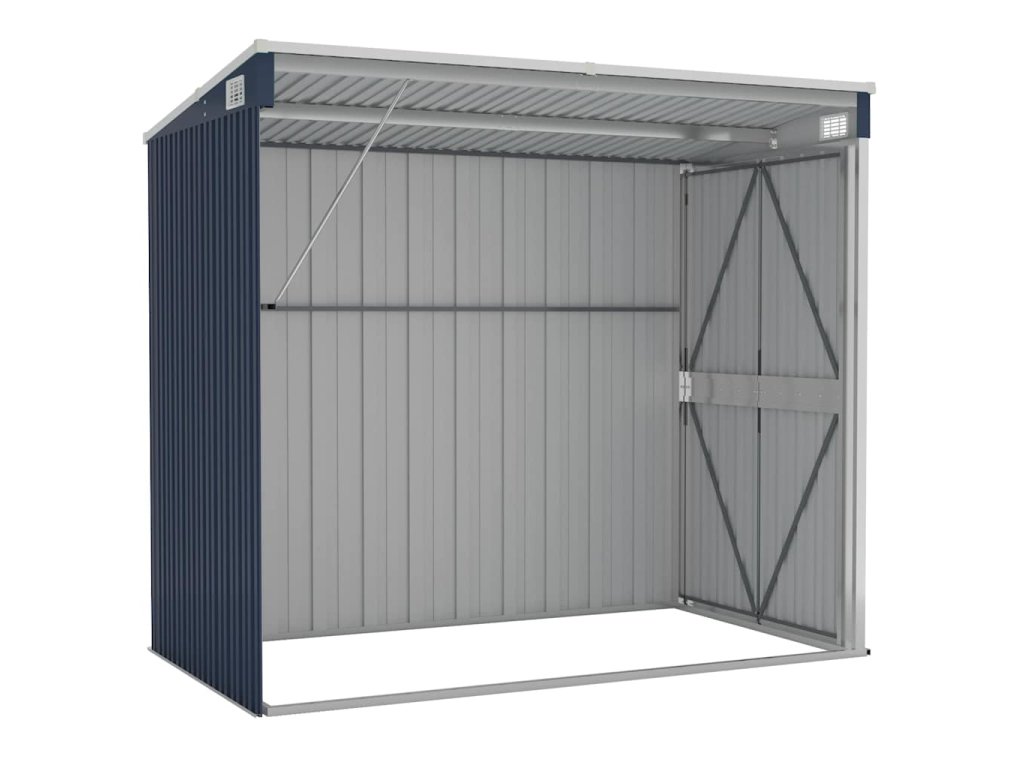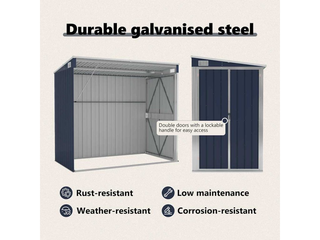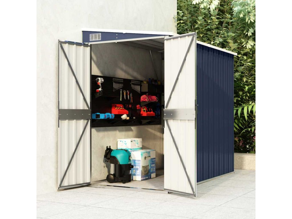 Keďže je vyrobený z pozinkovanej ocele a kovu, skladovací domček vyžaduje minimálnu údržbu a je veľmi odolný. Dvojité otváracie dvere vpredu umožňujú jednoduchý vstup a výstup. Plastová rukoväť s funkciou zámku zaisťuje bezpečnosť vašich vecí. Okrem toho dažďová voda automaticky odteká zo strechy vďaka šikmej konštrukcii.