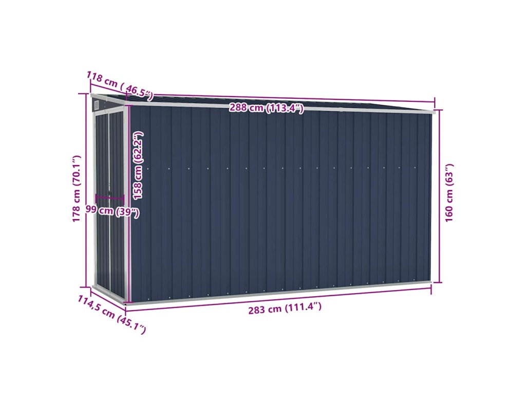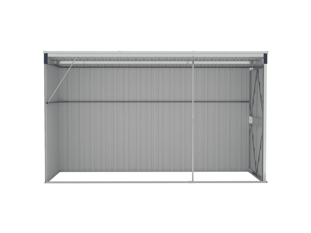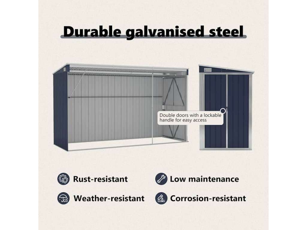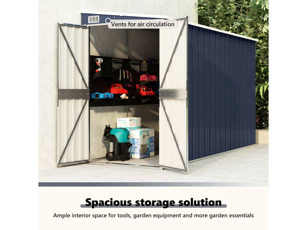 Keďže je vyrobený z pozinkovanej ocele a kovu, skladovací domček vyžaduje minimálnu údržbu a je veľmi odolný. Dvojité otváracie dvere vpredu umožňujú jednoduchý vstup a výstup. Plastová rukoväť s funkciou zámku zaisťuje bezpečnosť vašich vecí. Okrem toho dažďová voda automaticky odteká zo strechy vďaka šikmej konštrukcii.
