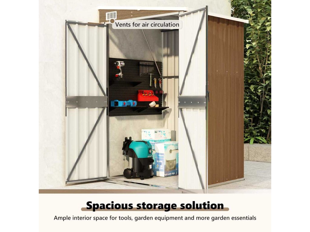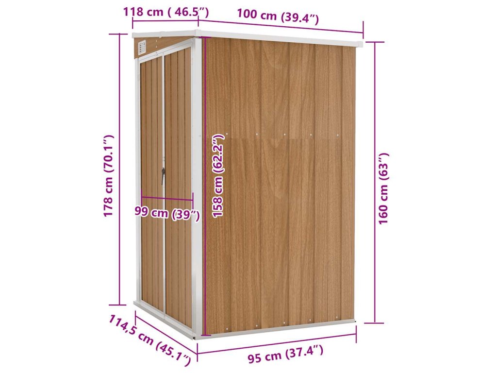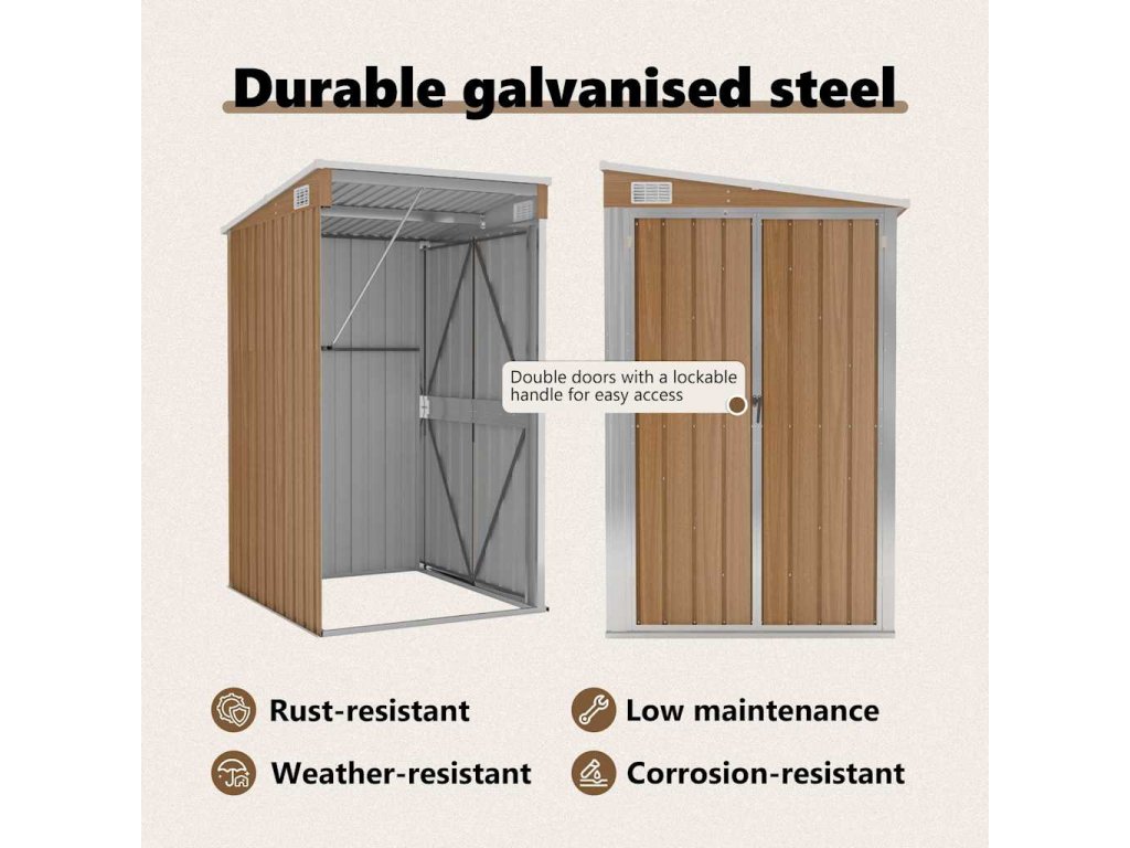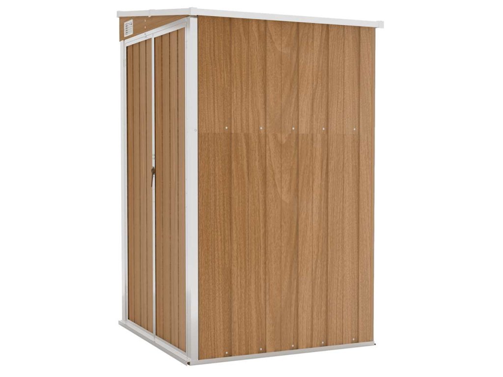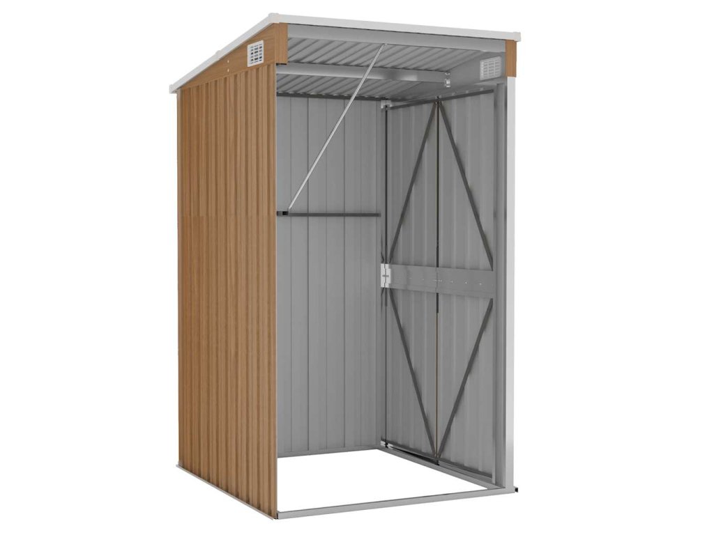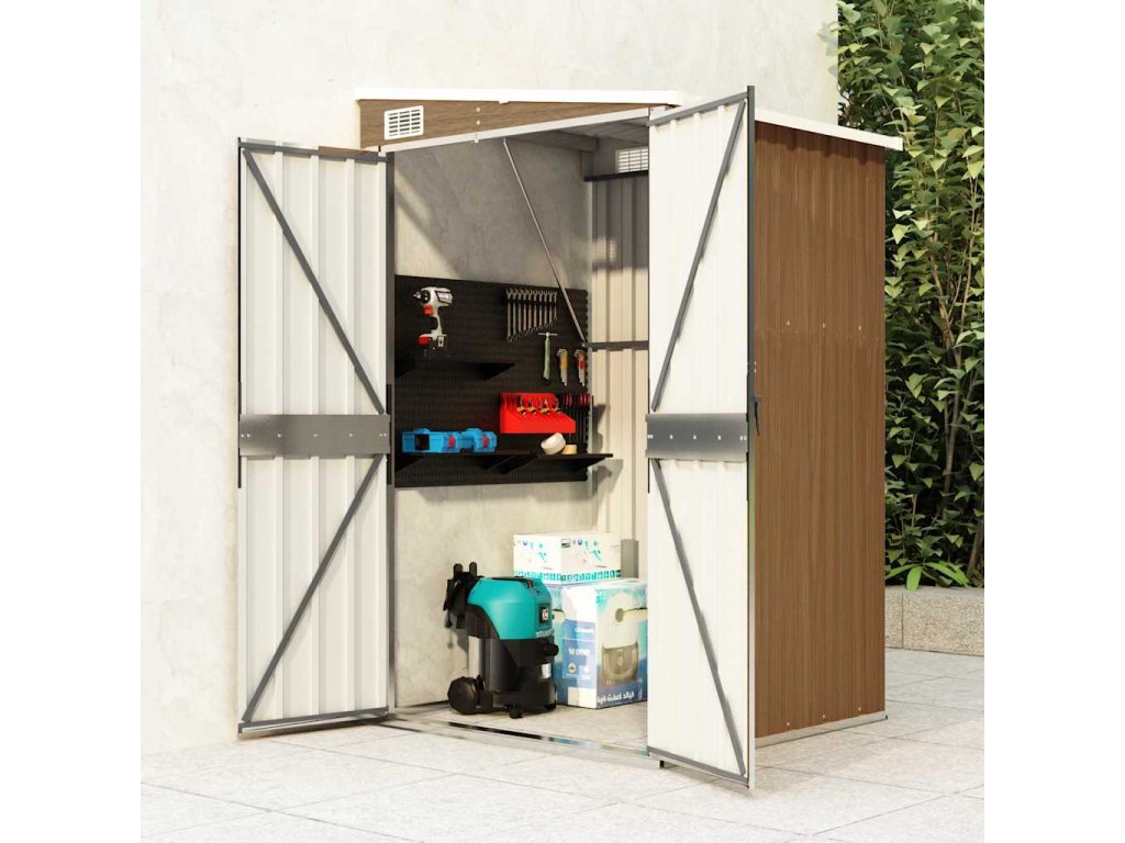 Keďže je vyrobený z pozinkovanej ocele a kovu, skladovací domček vyžaduje minimálnu údržbu a je veľmi odolný. Dvojité otváracie dvere vpredu umožňujú jednoduchý vstup a výstup. Plastová rukoväť s funkciou zámku zaisťuje bezpečnosť vašich vecí. Okrem toho dažďová voda automaticky odteká zo strechy vďaka šikmej konštrukcii.