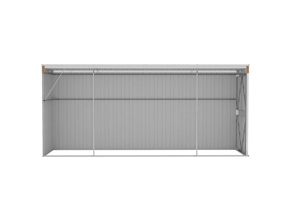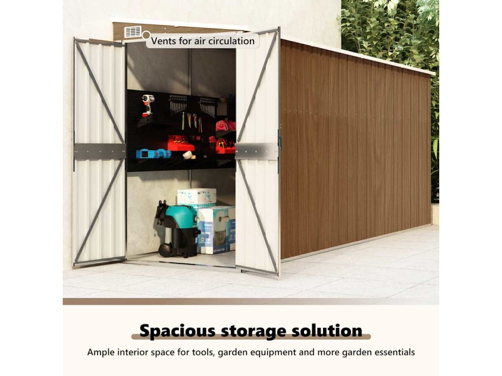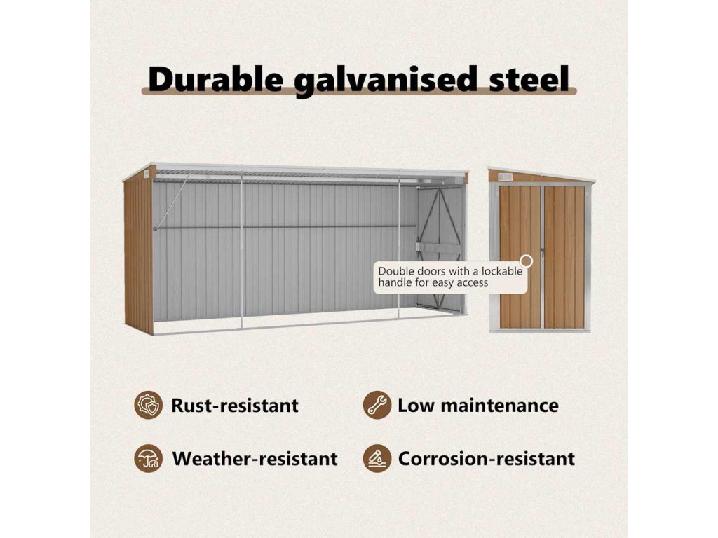 Keďže je vyrobený z pozinkovanej ocele a kovu, skladovací domček vyžaduje minimálnu údržbu a je veľmi odolný. Dvojité otváracie dvere vpredu umožňujú jednoduchý vstup a výstup. Plastová rukoväť s funkciou zámku zaisťuje bezpečnosť vašich vecí. Okrem toho dažďová voda automaticky odteká zo strechy vďaka šikmej konštrukcii.