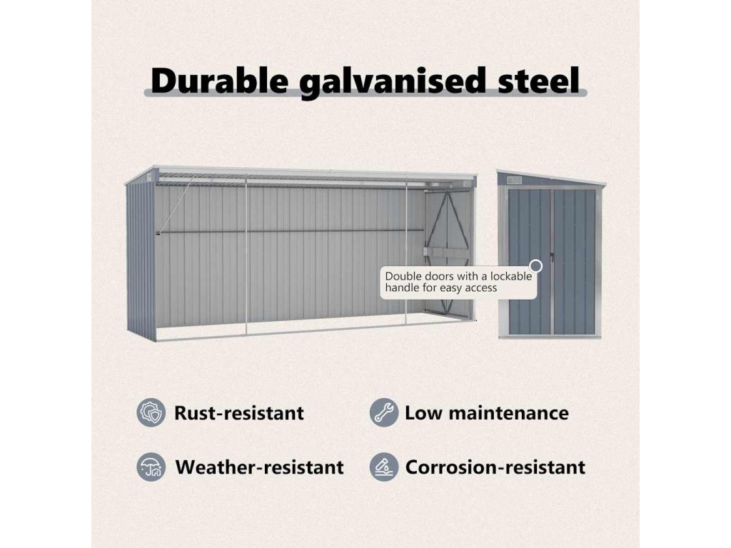 Keďže je vyrobená z pozinkovanej ocele a kovu, vyžaduje si minimálnu údržbu a je veľmi odolná. Dvojité otváracie dvere v prednej časti umožňujú ľahký vstup a výstup. Plastová rukoväť s funkciou zámku zaisťuje bezpečnosť. Dažďová voda automaticky odteká zo strechy vďaka šikmej konštrukcii.