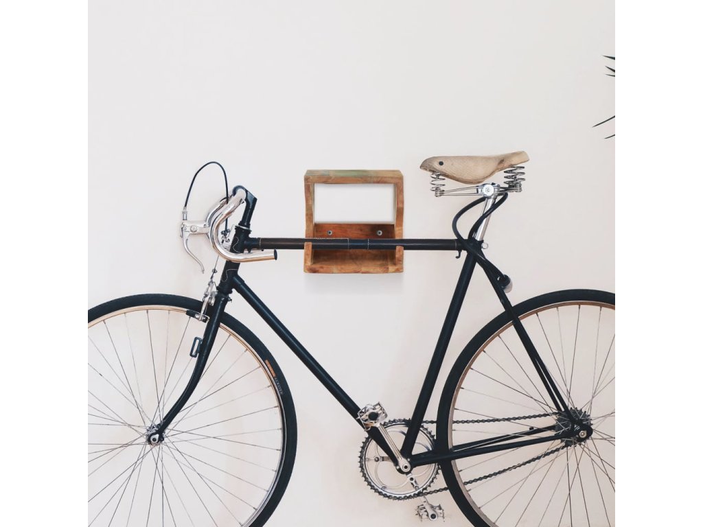 Tento priestorovo úsporný držiak bicykla sa dá pripevniť na stenu a zavesiť tak bicykle o rovnú tyč. Je vyrobený z masívneho recyklovaného dreva, ktoré pochádza z trámov, podláh a nosníkov starých zbúraných stavieb. Pozostáva z rôznych druhov drevín ako je napríklad akáciaové (palisander), borovicové, teakové, bukové, dubové, céderové, mangovníkové alebo akáciové drevo. Recyklované drevo si zachováva vlastnosti týchto drevín. Drevo je staré, zvetrané a vysušené, takže sa nezmršťuje ani neohýba a nevyžaduje si povrchovú úpravu. Tento držiak je ručne vyrobený a vďaka krásnej štruktúre dreva je každý kus jedinečný a mierne odlišný od ostatných kusov. Držiak pomáha usporiadať priestor a môže byť použitý v cyklistických obchodoch, garážach, prístreškoch alebo na balkónoch.