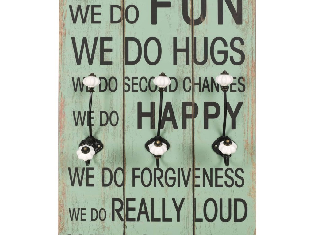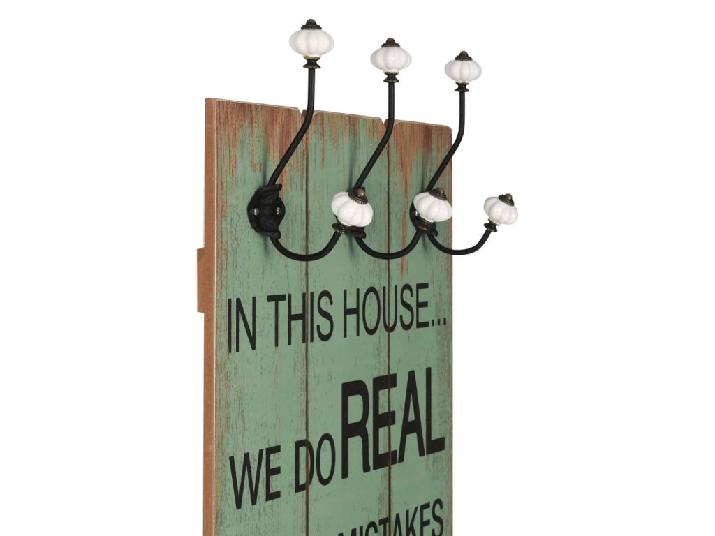 Tento nástenný vešiak na kabáty so 6 háčikmi, s nápisom vo vintage štýle, ktorý znamená "V tomto dome...robíme skutočné veci, robíme chyby, bavíme sa, objímame sa, dávame druhé šance, sme šťastní, odpúšťame, sme hluční, tvoríme rodinu, máme sa radi"; sa stane skutočne pútavým prvkom, ktorý si vaši hostia okamžite všimnú.