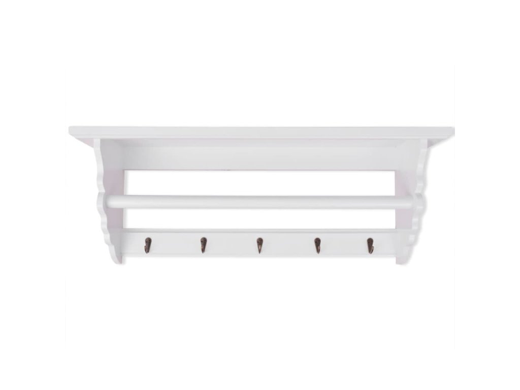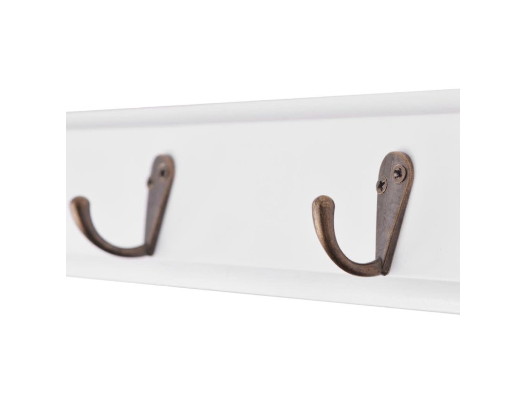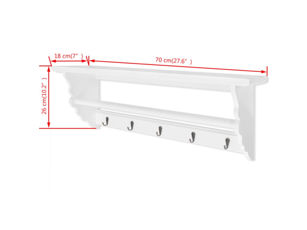 Vešiak má poličku, ktorá slúži ako ideálne miesto na ukladanie vecí ako sú trofeje, knihy, ozdoby a pod. S 5 háčikmi a 1 drevenou tyčou poskytuje dostatok úložného priestoru pre zavesenie vašich šatiek, kravát, kabátov, tašiek, čiapiek, kľúčov atď. Je vyrobený z vysoko kvalitného MDF (drevovlákno), čo mu zaručí trvácnosť.