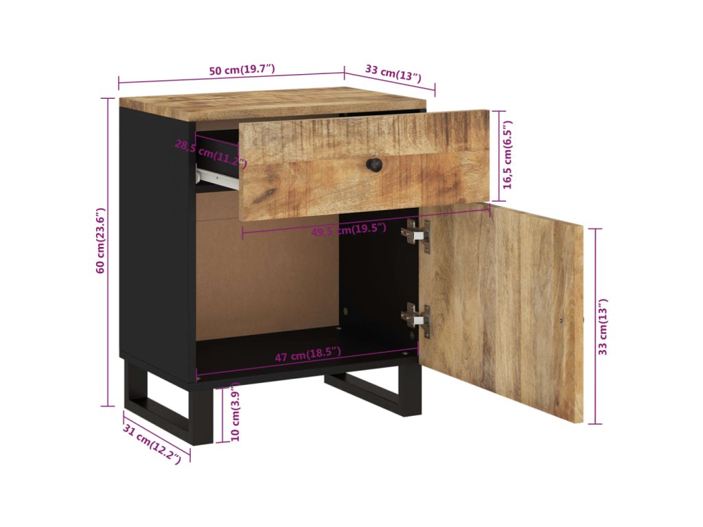 - Masívne mangovníkové drevo: Táto skrinka je vyrobená z masívneho mangovníkového dreva, čo je tvrdé drevo s bohatou štruktúrou. Masívne mangovníkové drevo nielenže unesie aj vyššiu hmotnosť, ale odoláva aj opotrebovaniu časom.