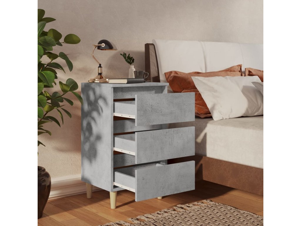 Nočný stolík so štyrmi drevenými nohami je stabilný a robustný. Je navyše vybavený troma zásuvkami, ktoré ponúkajú dostatok úložného priestoru na uloženie a organizáciu vecí. Ľahko sa čistí vlhkou handričkou.