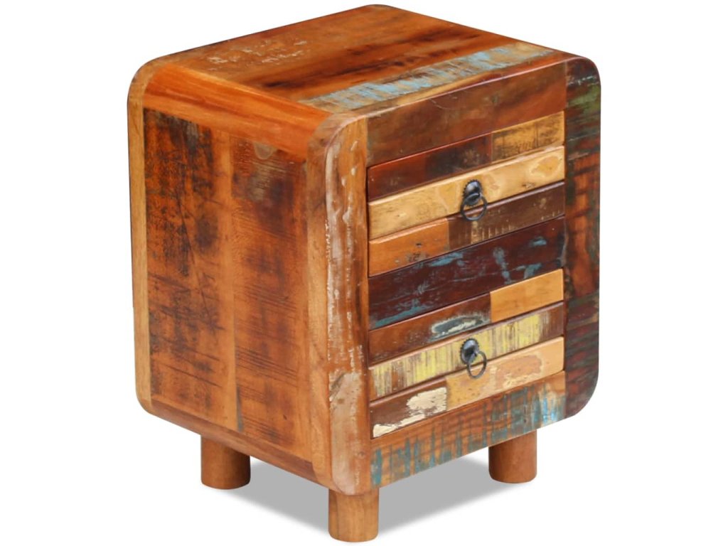 Skrinka je vyrobená z recyklovaného masívu, ktorý je pevný, trvácny a krásny a má podobné vlastnosti ako napríklad mangové drevo, akáciové, recyklované, tvrdé drevo a podobne. Každý kus nábytku je jedinečný a trochu odlišný od ostatných. Známky opotrebovania a viditeľná textúra dreva odrážajú históriu jednotlivých kúskov nábytku a dodávajú im jedinečný vzhľad.