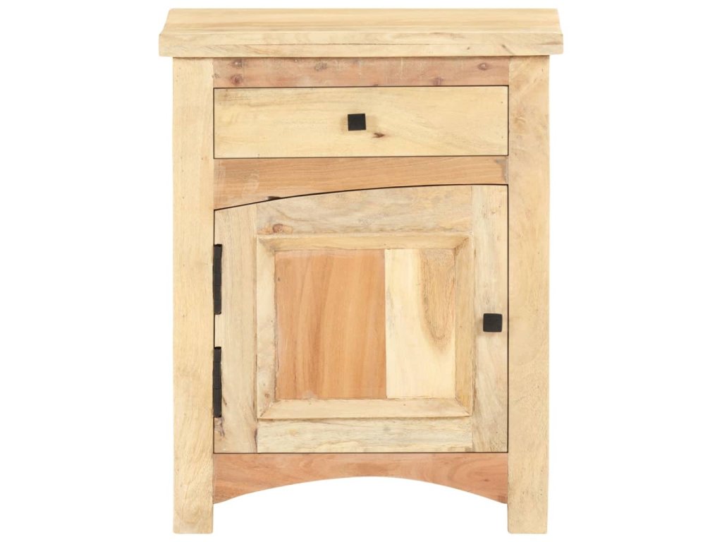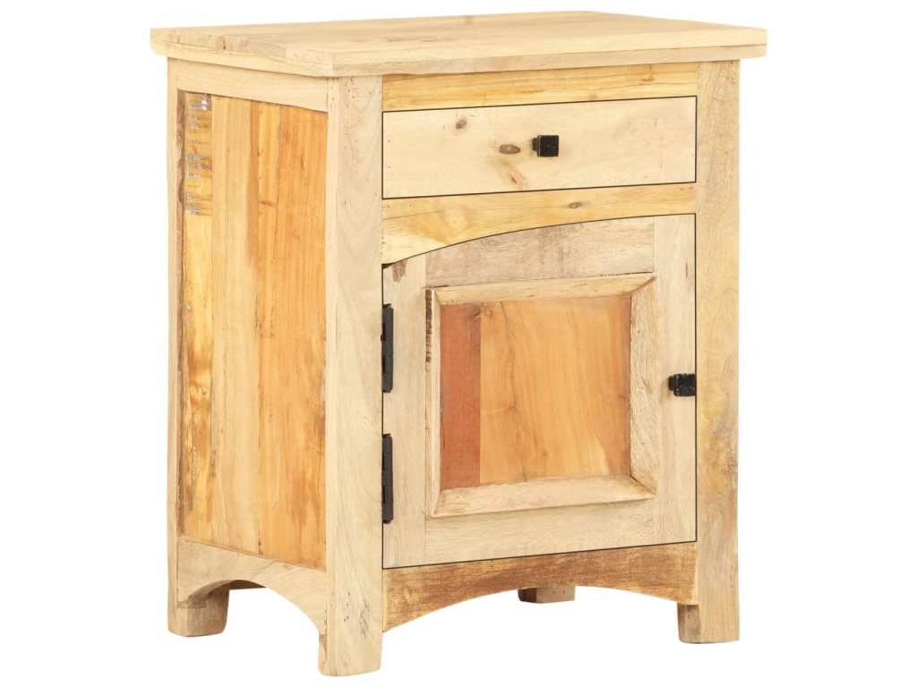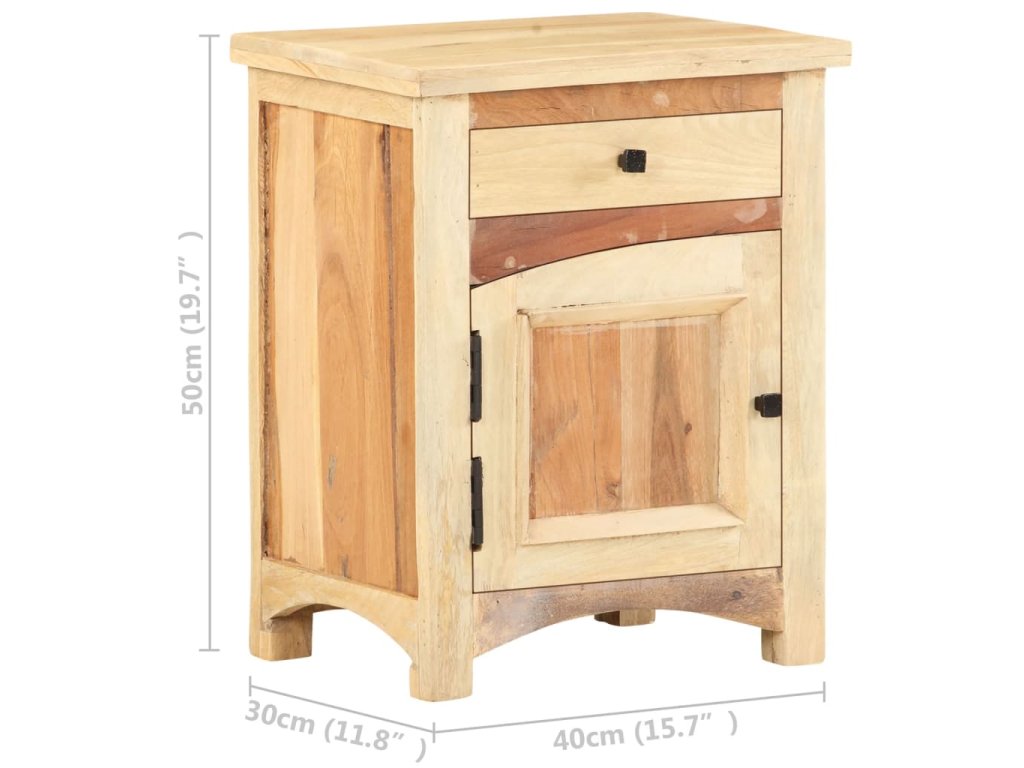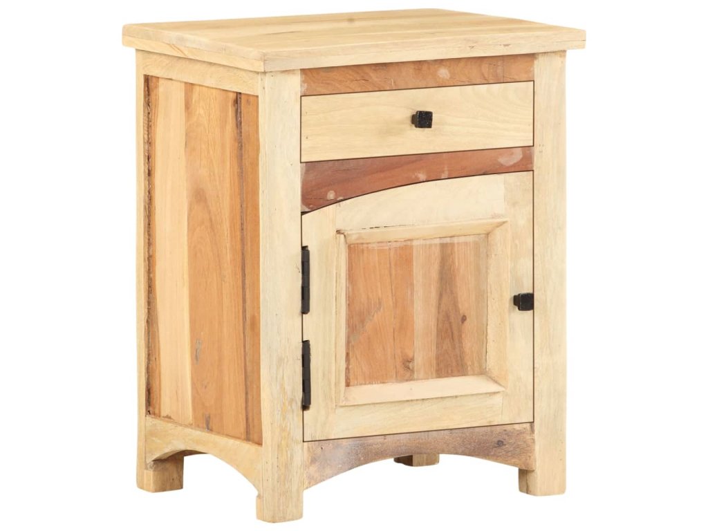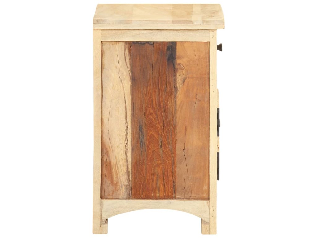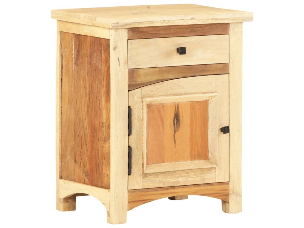 Nočný stolík je vyrobený z mangového a recyklovaného masívu, ktorý pochádza z trámov, podláh a nosníkov zo starých zbúraných stavieb a pozostáva z rôznych typov dreva, ako napríklad borovicového, tíkového, bukového, dubového, cédrového, mangového či akáciového dreva. Recyklované drevo sa preto vyznačuje vlastnosťami týchto typov dreva. Recyklované drevo je staré, zvetrané a usušené, a preto sa nezmršťuje ani neohýba. Každý krok výrobného procesu sa vykonáva s najväčšou starostlivosťou, či už je to leštenie alebo lakovanie. Vďaka vynikajúcemu remeselnému opracovaniu a krásnej textúre dreva je každý kus nábytku výnimočný a trochu odlišný od ostatných. Skrinka na telefón navyše obsahuje 1 zásuvku a 1 dvierka, ktoré poskytujú ideálne miesto na odkladanie menších predmetov, ktoré tak budete mať vždy poruke. Nočný stolík sa jednoducho montuje.