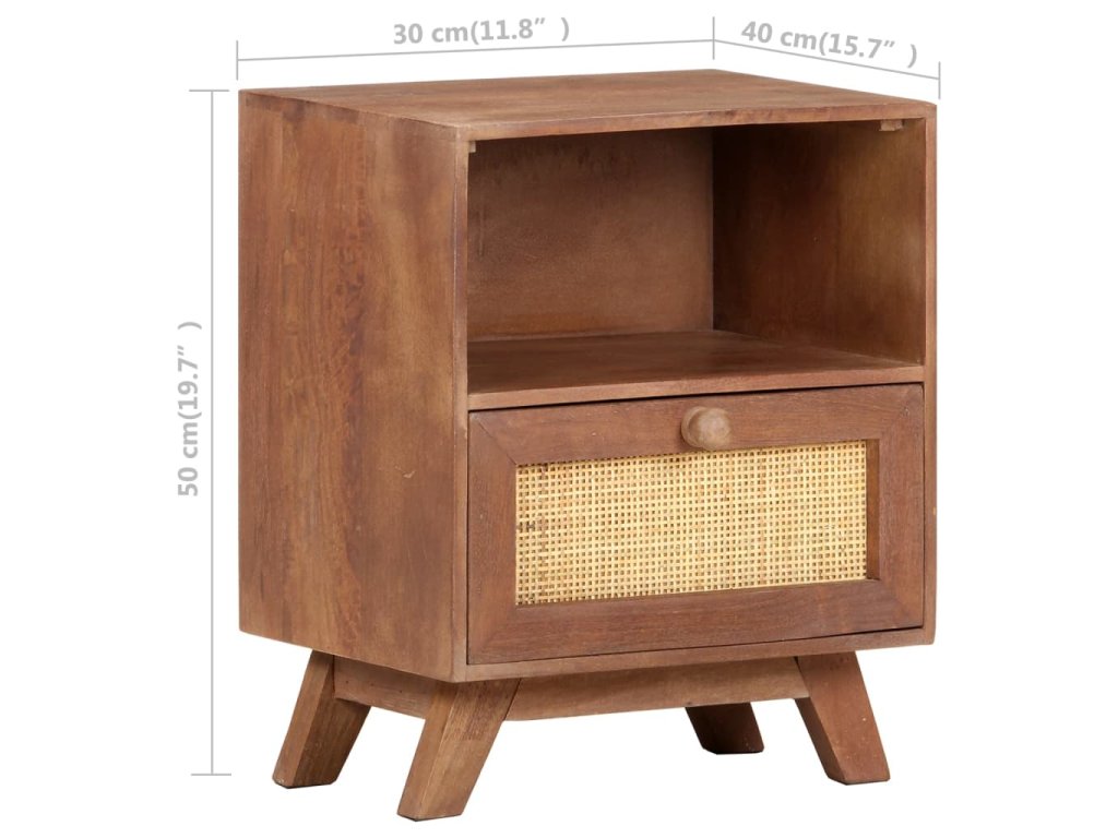 Tento nočný stolík je vyrobený z masívneho mangovníkového dreva, tropického tvrdého dreva. Mangovníkové drevo nielenže unesie aj vyššiu hmotnosť, ale odoláva aj opotrebovaniu časom. Vďaka vynikajúcemu remeselnému spracovaniu a krásnej štruktúre dreva je každý kus trochu iný od ostatných. Táto bočná skrinka má zásuvku a policu, takže do nej môžete umiestniť knihy, časopisy a iné predmety. Pevná vrchná časť je ideálna na umiestnenie hodín a lámp.