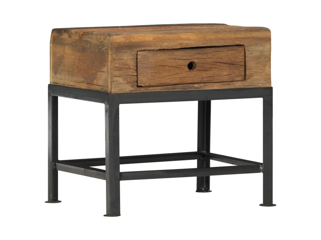 Nočný stolík je vyrobený z masívneho recyklovaného dreva, ktoré pochádza z trámov, podláh a nosných trámov. Je už zostarnuté, zvetrané a vysušené, takže sa nezmršťuje ani neohýba. Známky opotrebovania a remeselného spracovania dodávajú každému kúsku jedinečný vzhľad a pridávajú k jeho veľkolepému vintage štýlu. Oceľové nohy s práškovým nástrekom navyše zvyšujú stabilitu odkladacieho stolíka, a podčiarkujú jeho industriálny vzhľad. Má pevnú hornú časť a zásuvku, čo poskytuje dostatok priestoru na uloženie rôznych predmetov, ako sú knihy, okuliare, ovládače, ktoré budú úhľadne usporiadané a na dosah ruky.