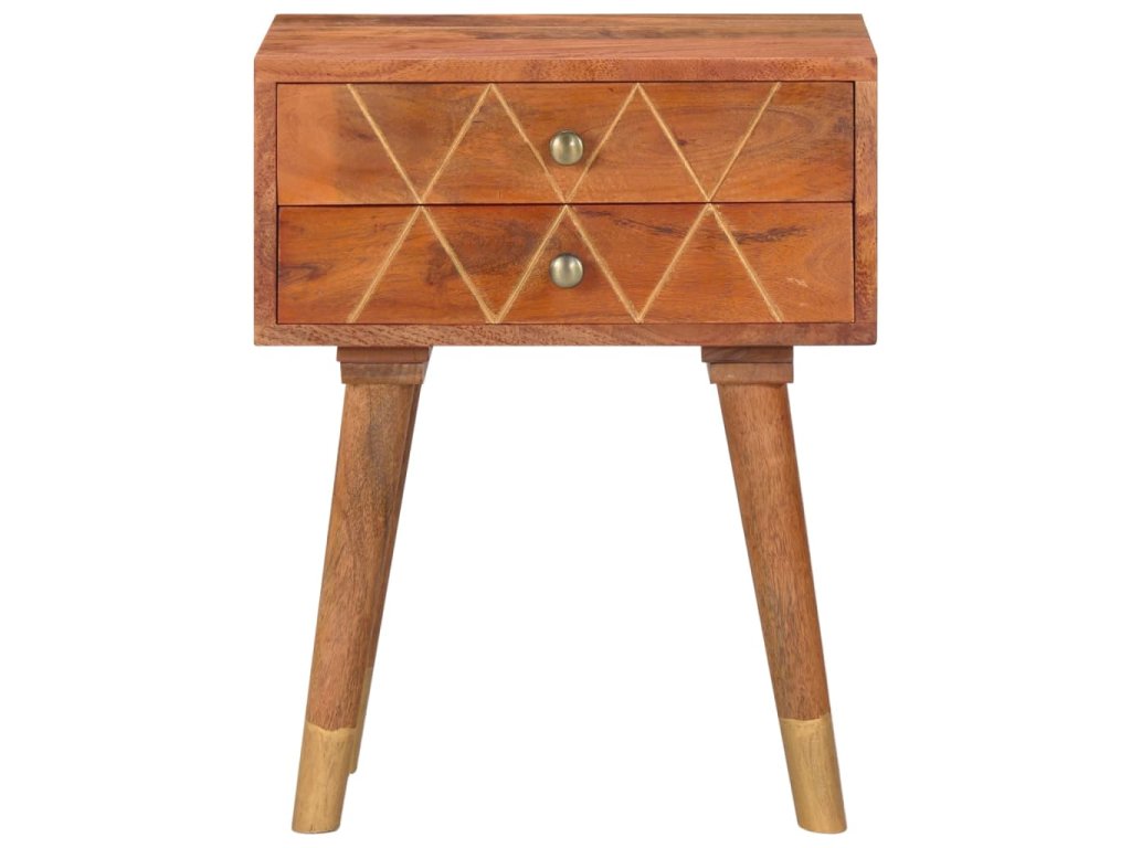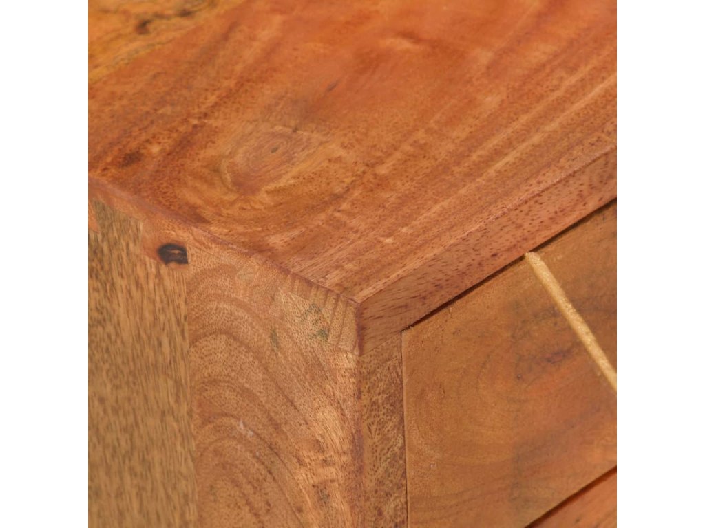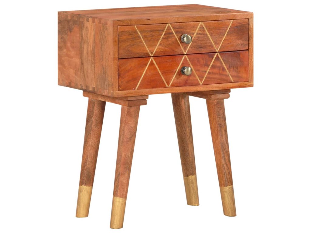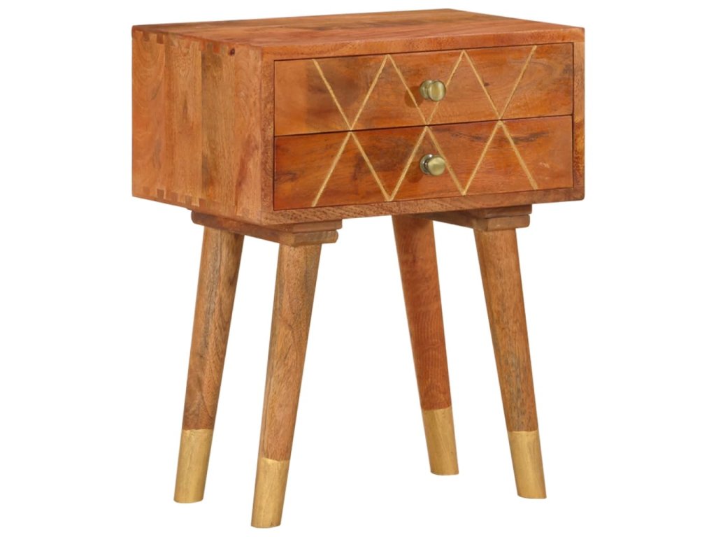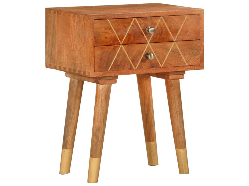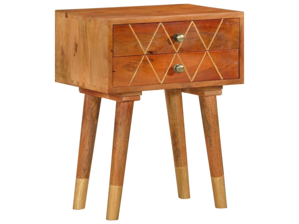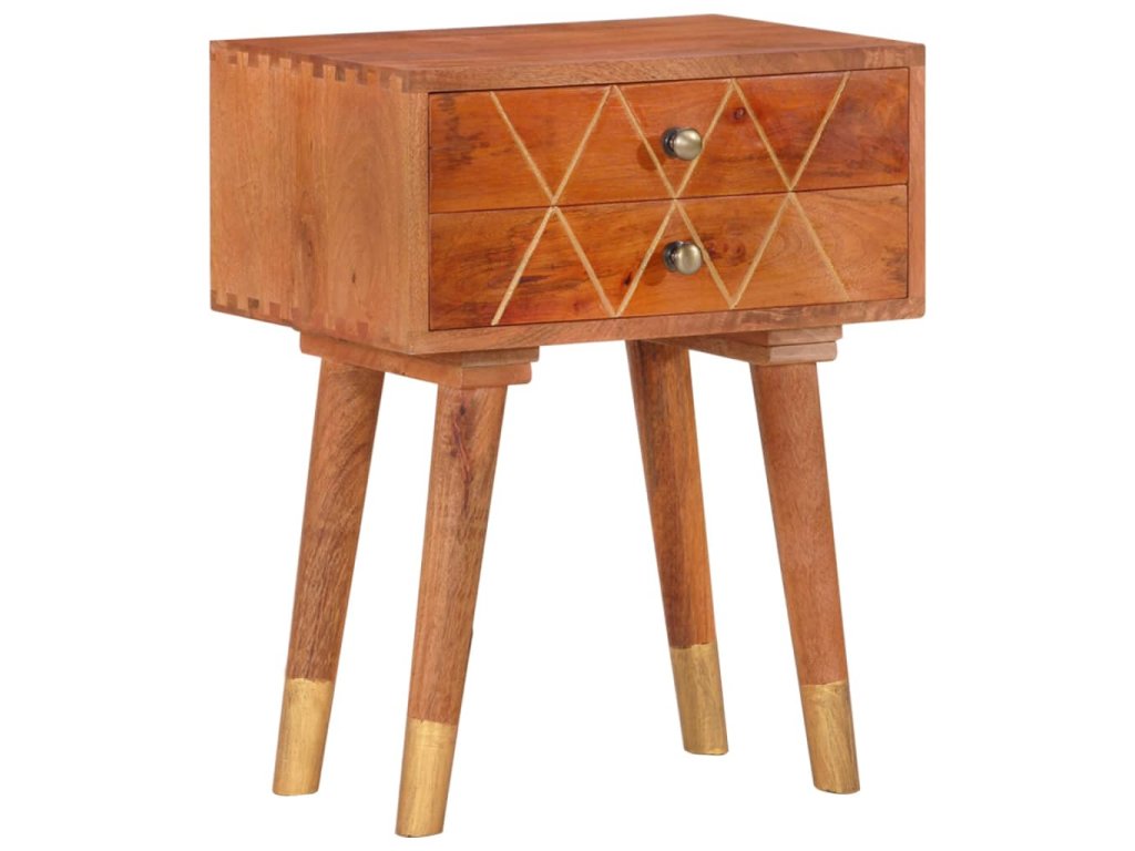 Nočný stolík je vyrobený z mangového masívu, ktorý bol leštený, natieraný a lakovaný a táto krásna povrchová úprava mu dodáva rafinovaný vzhľad. Mangové drevo je husté a robustné tvrdé drevo, ktoré má na svojom povrchu krásne hnedé alebo zlatisté prúžky a kresby. 2 zásuvky poskytujú množstvo úložného priestoru na odkladanie menších predmetov, ktoré tak budete mať vždy poruke.