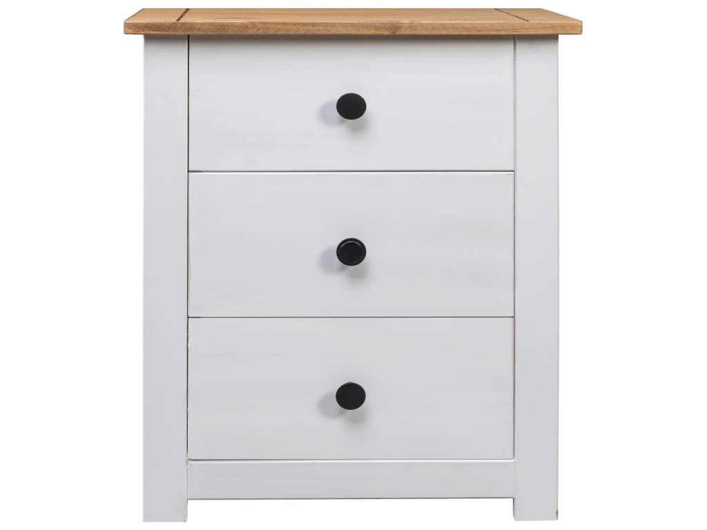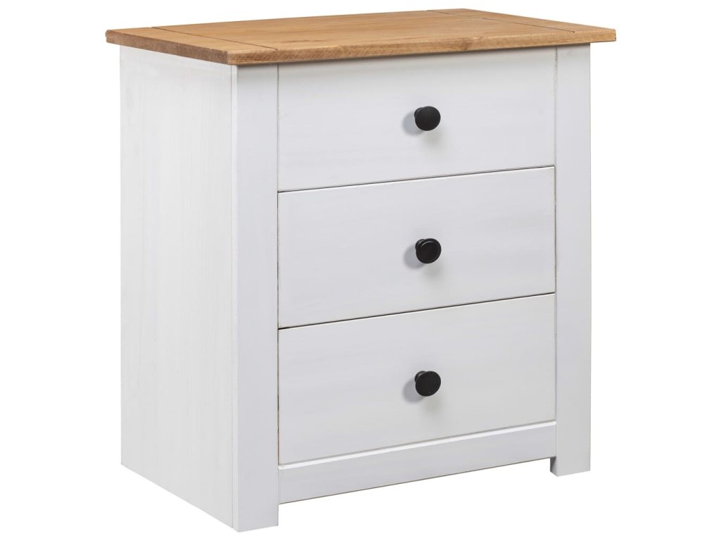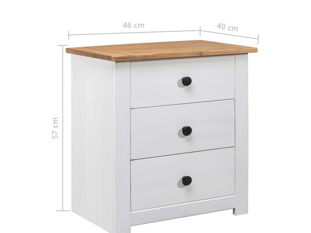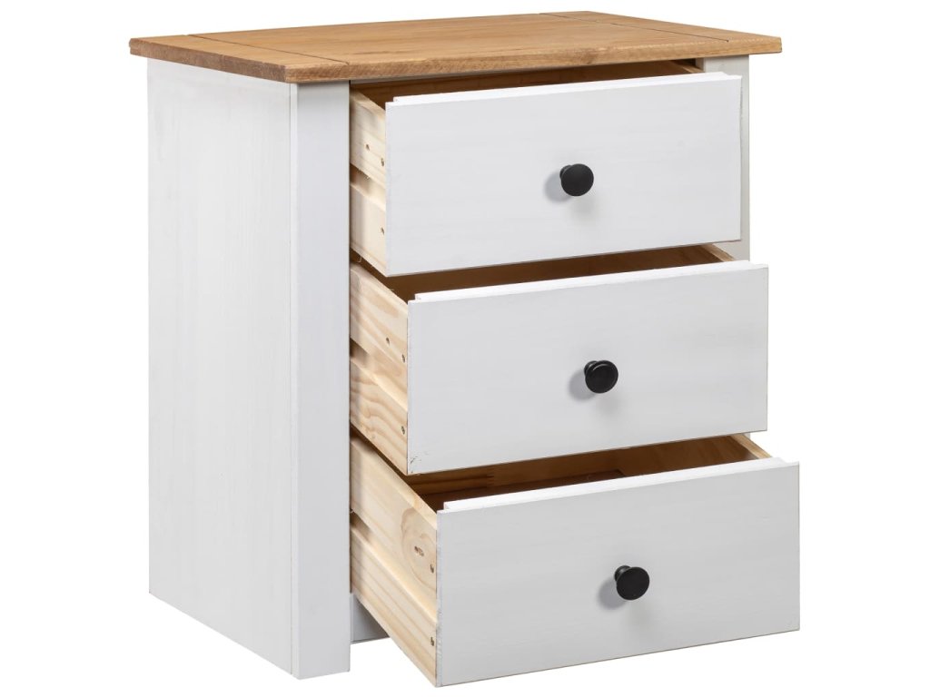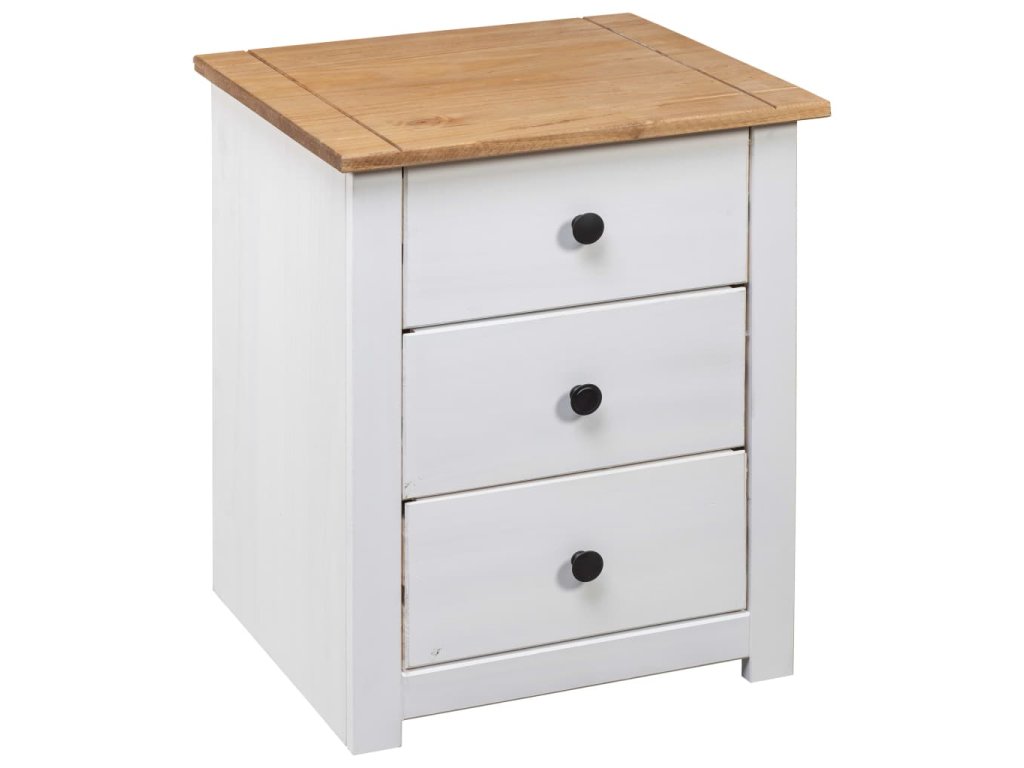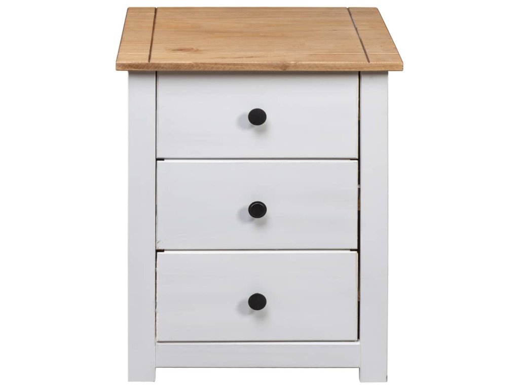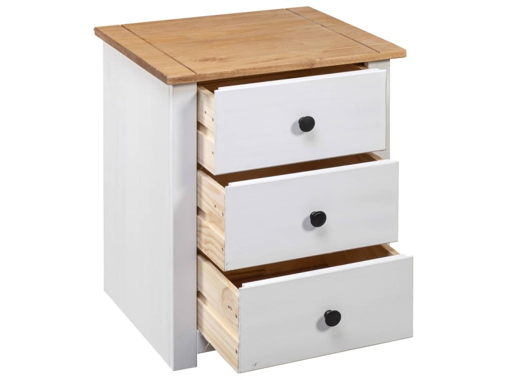 Nočný stolík je vyrobený z masívneho borovicového dreva a je veľmi stabilný a odolný. Jeho pevná vrchná doska je ideálna na umiestnenie dekoratívnych predmetov, ako sú vázy alebo rastliny v črepníkoch. Skrinka je vybavená 3 zásuvkami a poskytuje dostatok úložného priestoru na dokonalé usporiadanie rôznych predmetov. Tento nočný stolík sa navyše ľahko čistí suchou handričkou.
