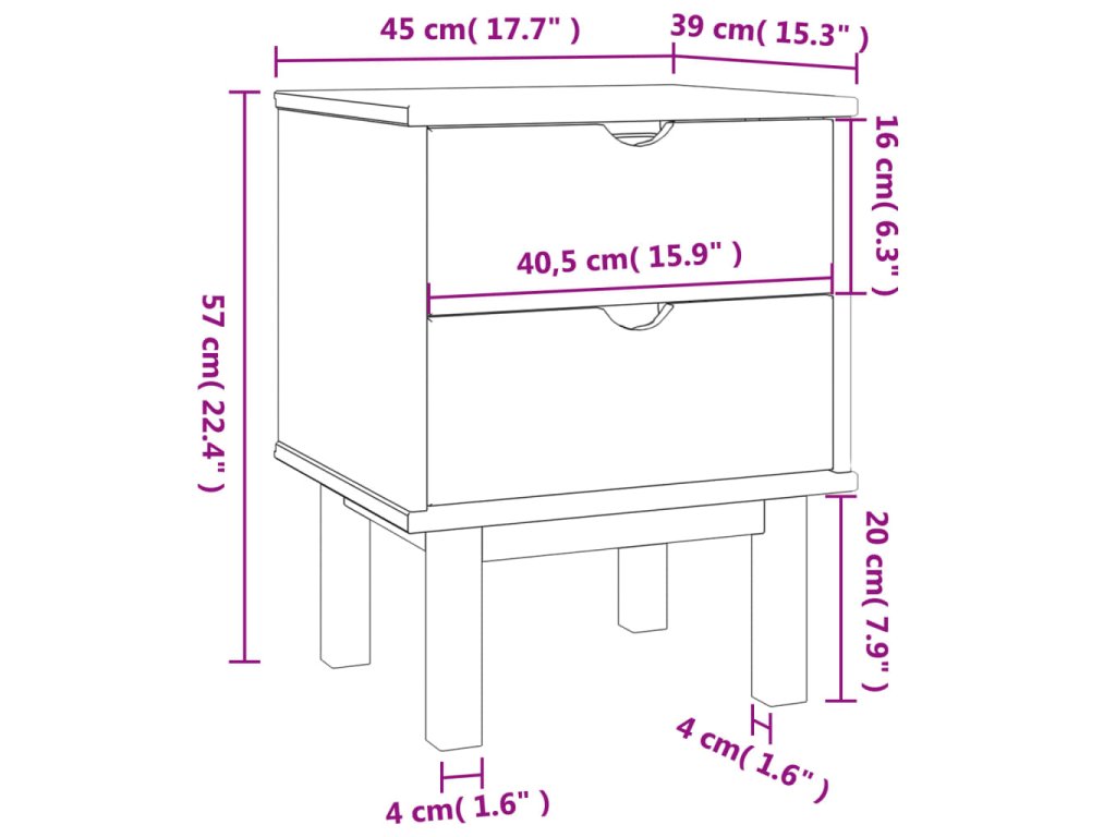 - Obsahuje 2 zásuvky a 4 drevené nohy