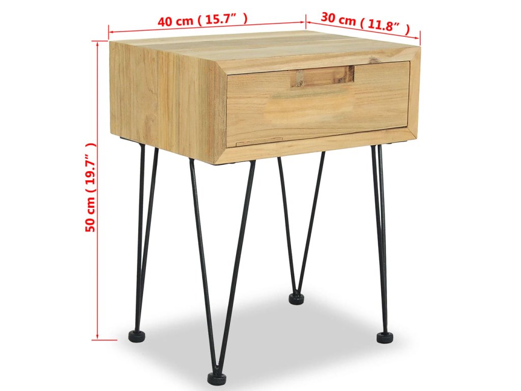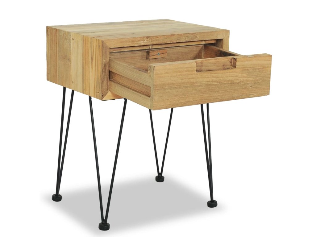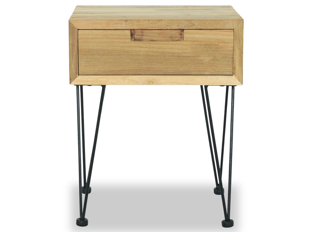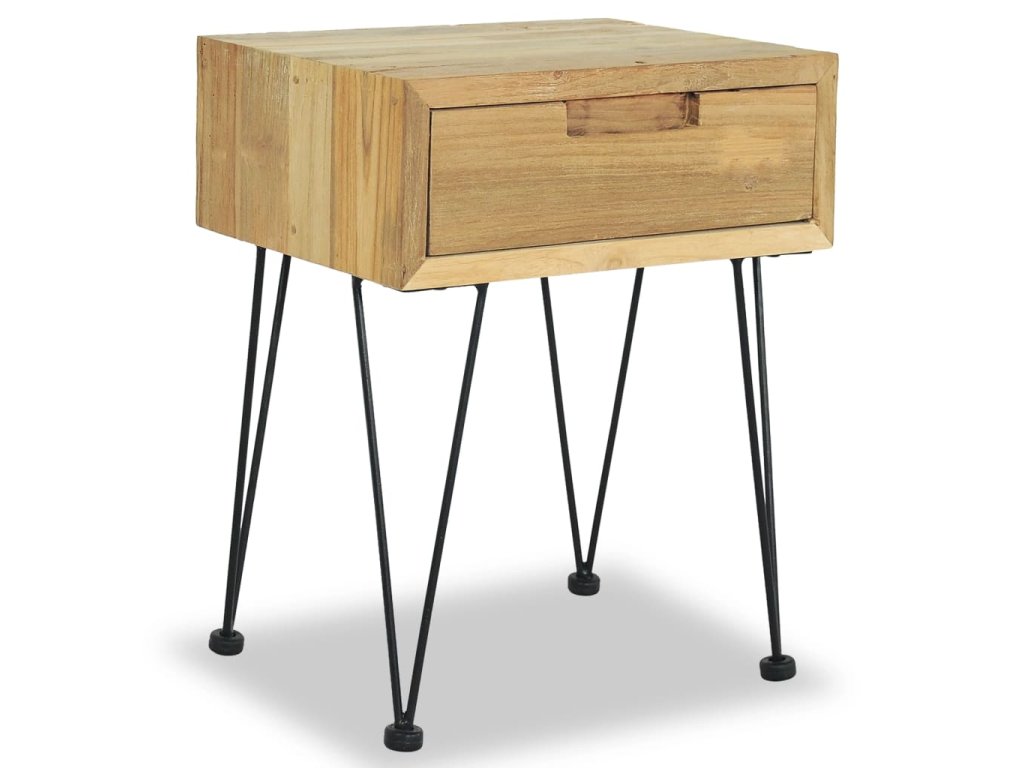 Nočný stolík má robustný drevený vrch, na ktorý môžete umiestniť lampičku, budík alebo čokoľvek iné, čo by potrebujete mať v blízkosti vašej postele. Zásuvka a skrinka poskytujú dostatok priestoru na uloženie všetkých menších predmetov. Tento pevný nočný stolík je podporovaný pevnými nohami z tepaného železa. Montáž je veľmi jednoduchá.