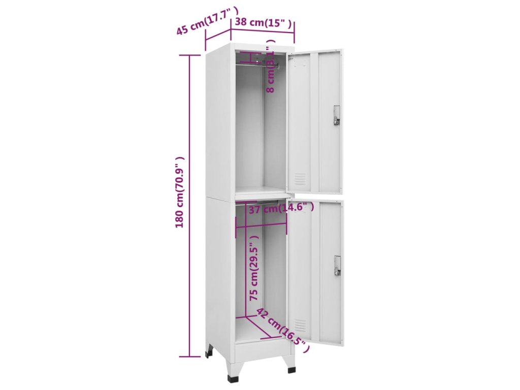 Táto šatňová skrinka obsahuje 2 priehradky s uzamykateľnými dvierkami, a tak ponúka množstvo úložného priestoru na bezpečné odkladanie oblečenia a iných osobných vecí. V každej priehradke sa nachádza tyč na zavesenie vecí a držiak na menovku. Skrinka je vyrobená z vysokokvalitnej ocele, vďaka čomu je trvácna a ľahko sa čistí. Montáž je naozaj jednoduchá.