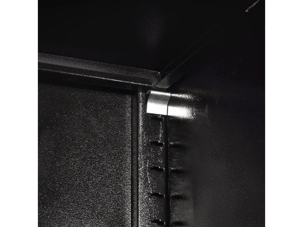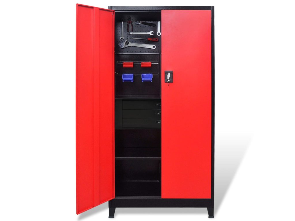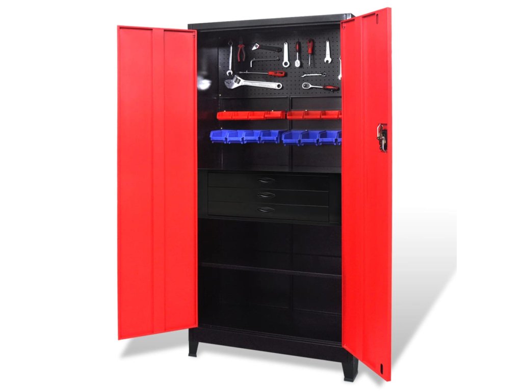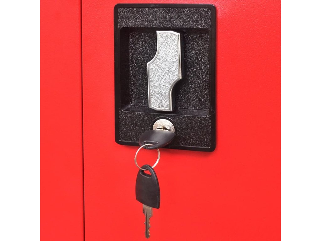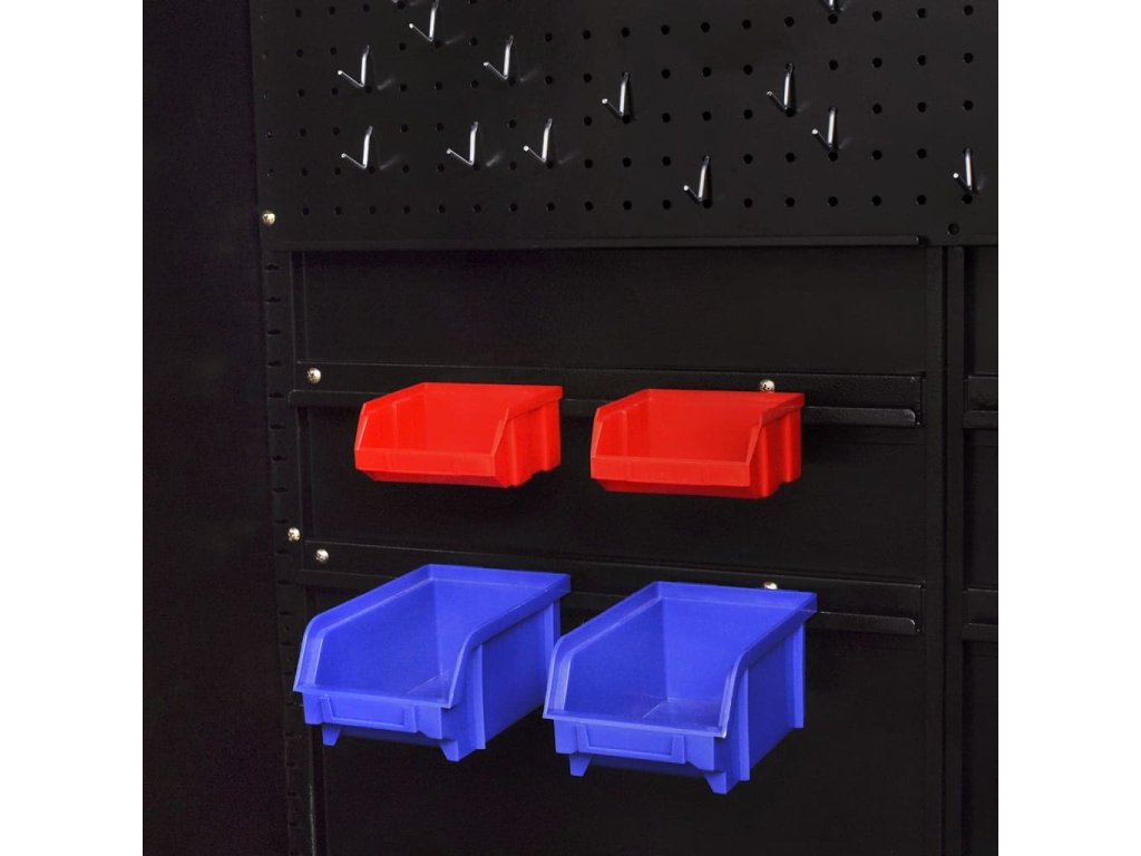 Skriňa je vyrobená z odolnej ocele s povrchovou úpravou odolnou voči poškriabaniu. Je veľmi pevná a trvácna. Vaše náradie a ďalšie veci budú v bezpečí vďaka 3-bodovému uzamykaciemu systému s 2 kľúčmi. Táto skriňa na náradie má 2 vstavané stojany na zavesenie zásobníkov (nie sú v balení) a 3 odnímateľné police s maximálnou nosnosťou 40 kg pre každú policu. Doska v zadnej časti sa dá použiť na zavesenie všetkých druhov náradia, ako sú kľúče, kliešte, kladivá atď. (Náradie a háčiky nie sú v balení).