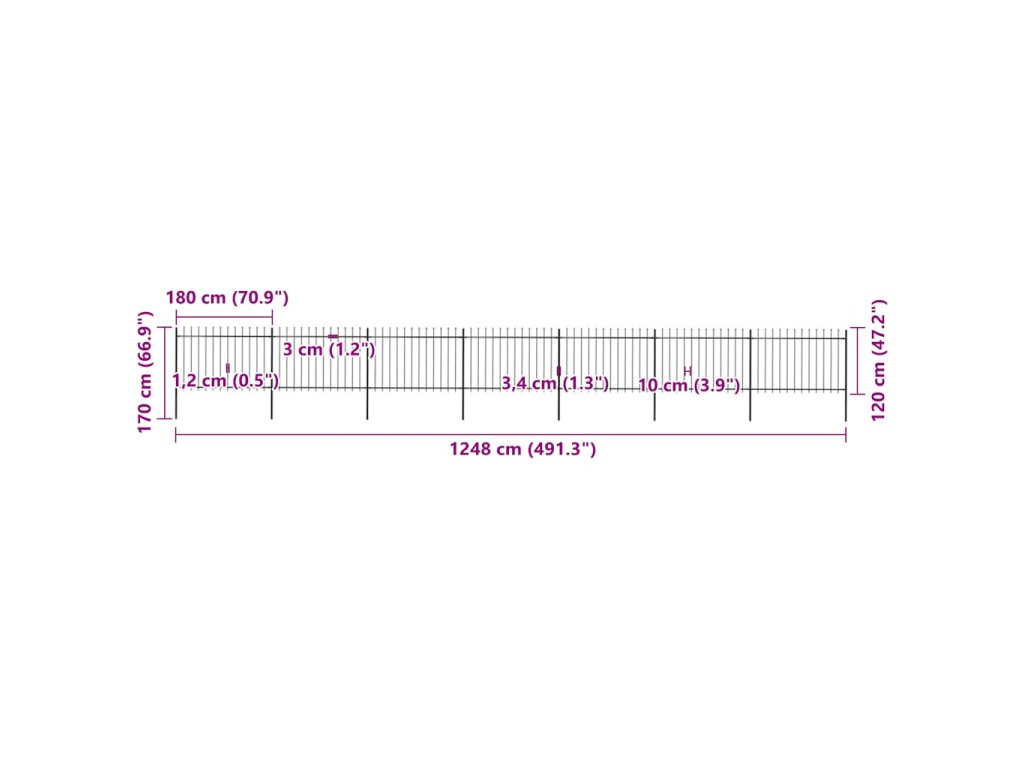 Vytvorte si okolo svojej záhrady, domu či chodníka elegantné oplotenie s našim záhradným plotom! Ozdobný oceľový záhradný plot pozostáva zo 7 plotových panelov a 8 stĺpikov a má celkovú dĺžku 11,9 metra. Umožní vám postaviť si robustnú a bezpečnú bariéru, ktorá si nevyžaduje žiadnu údržbu a ktorá ohraničí vašu záhradu, dom či komerčné priestory.