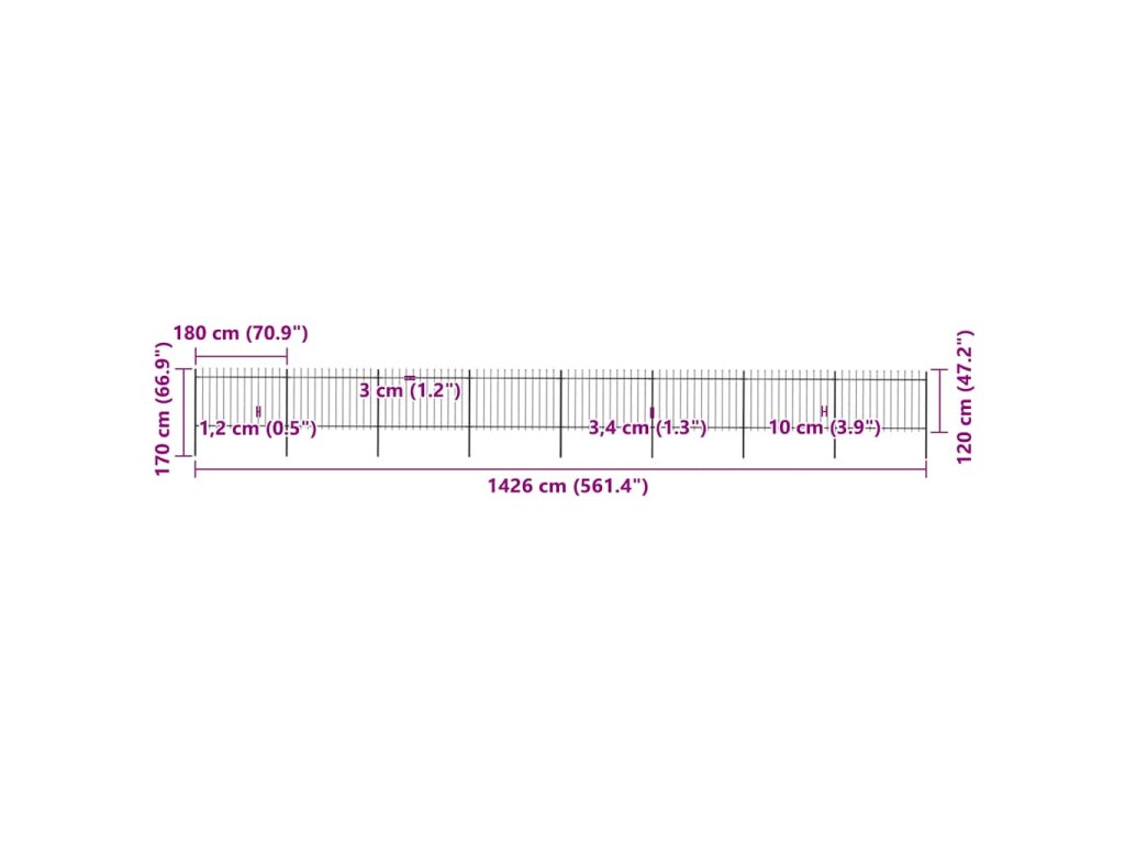 Vytvorte si okolo svojej záhrady, domu či chodníka elegantné oplotenie s našim záhradným plotom! Ozdobný oceľový záhradný plot pozostáva z 8 plotových panelov a 9 stĺpikov a má celkovú dĺžku 13,6 metra. Umožní vám postaviť si robustnú a bezpečnú bariéru, ktorá si nevyžaduje žiadnu údržbu a ktorá ohraničí vašu záhradu, dom či komerčné priestory.