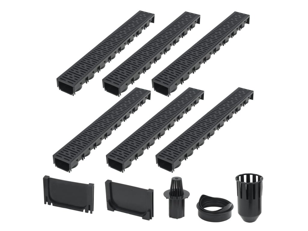 Táto kompletná sada pozostáva zo 6 odvodňovacích žľabov s plastovými mriežkami, 1 filtračného systému, 1 spodného výpustného konektora a 2 koncových uzáverov. Predstavuje dokonalé riešenie, ktoré umožní zber a odvádzanie prebytočnej vody z príjazdových ciest, terás a iných vonkajších plôch.