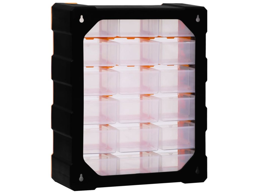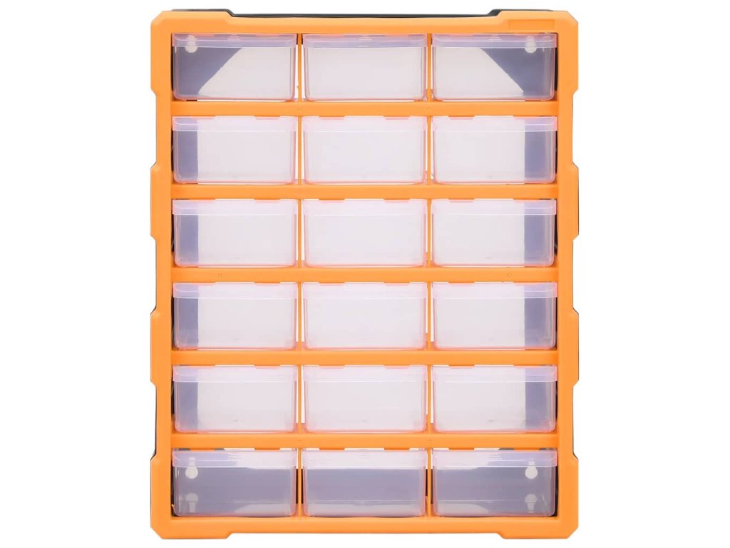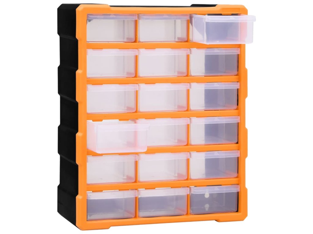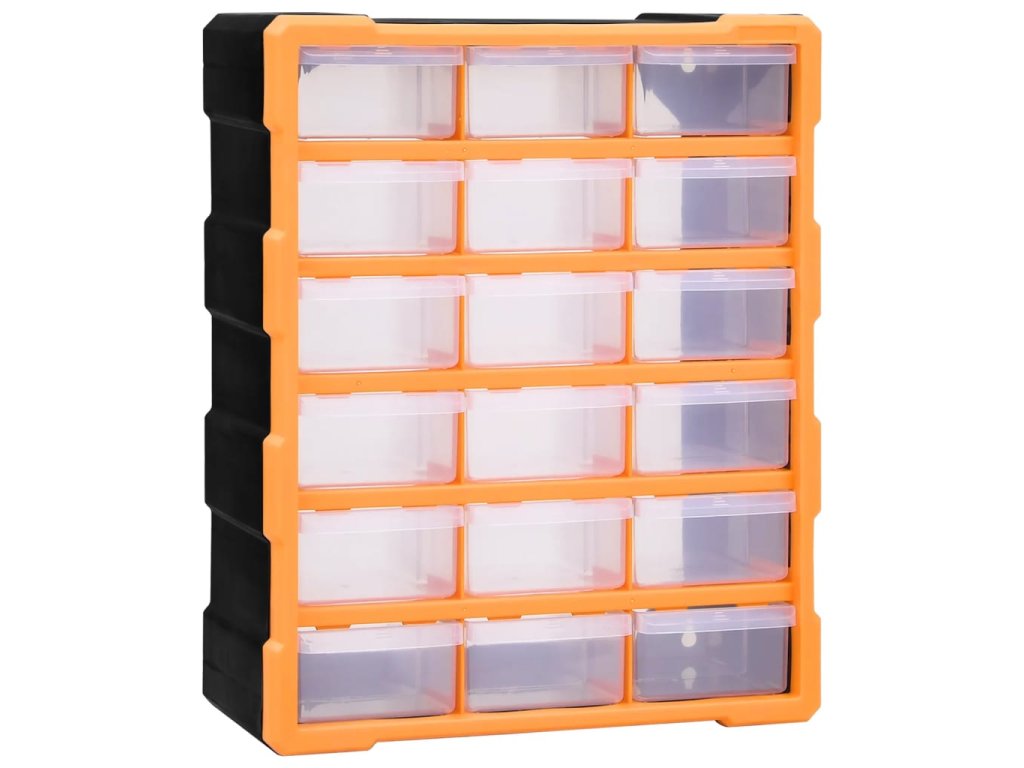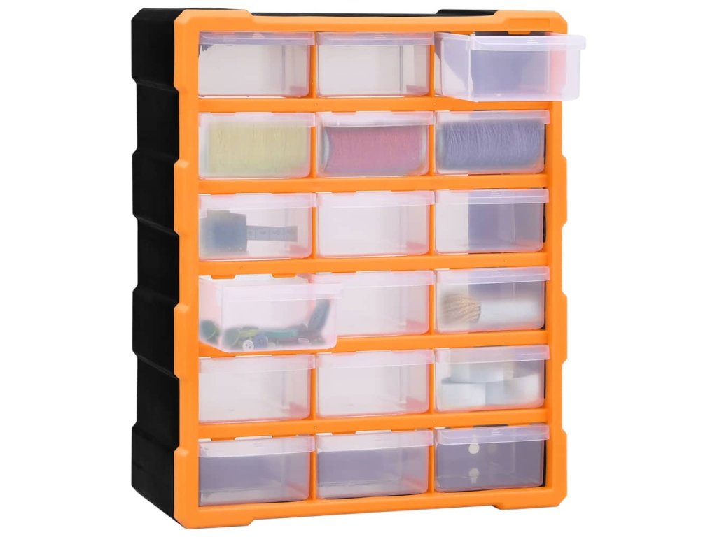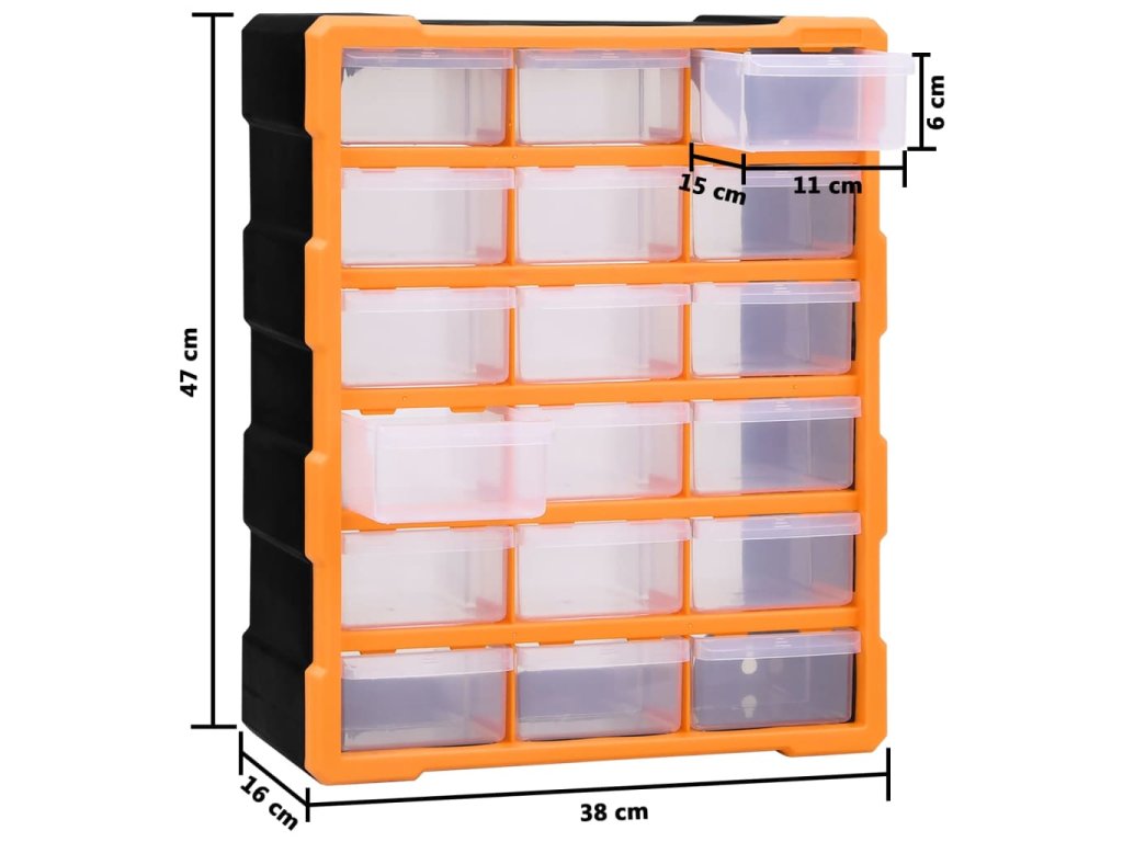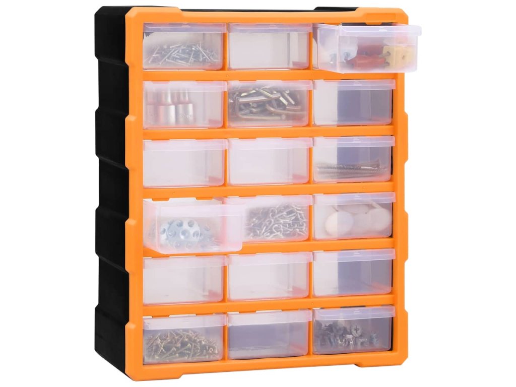 Úložná jednotka obsahuje 18 stredne veľkých zásuviek, do ktorých si budete môcť odložiť náradie dennej potreby a ktoré sa postarajú o to, aby bolo vaše ručné náradie a príslušenstvo, ako napríklad rôzne spojovacie prvky, vždy prehľadne uložené a poruke. Skrinka na náradie je vyrobená z nárazuvzdorného plastu, ktorý je trvácny a stabilný. Zásuvky sú vyrobené z priehľadného plastu, a tak hneď uvidíte, čo je vo vnútri. Box poskytuje ideálne miesto na odkladanie matíc, skrutiek, klincov, úchytov a rôznych iných súčiastok.