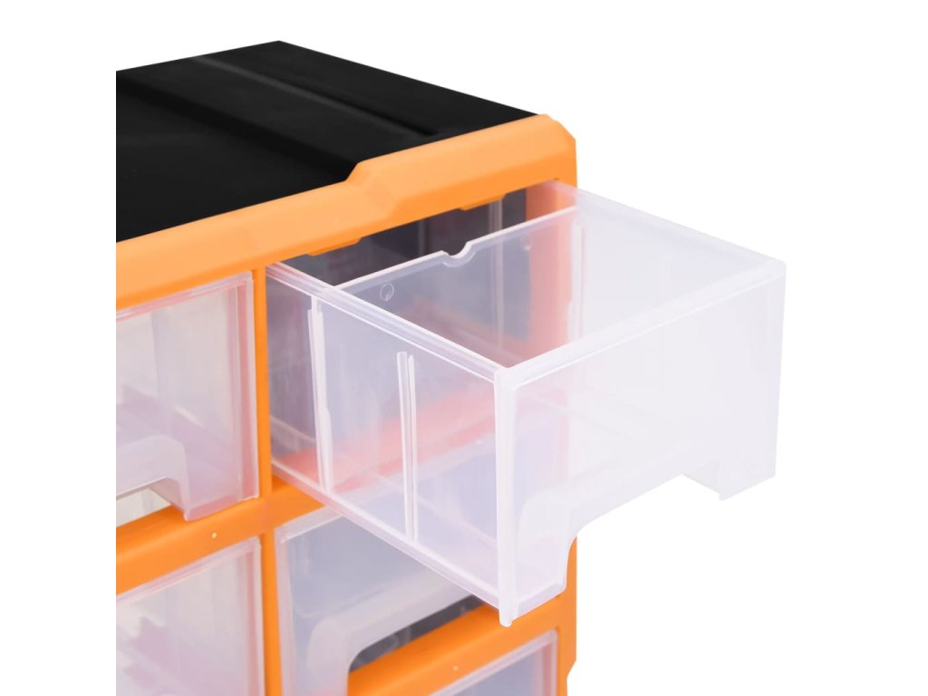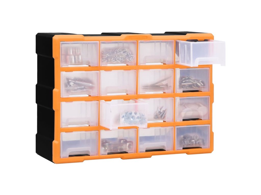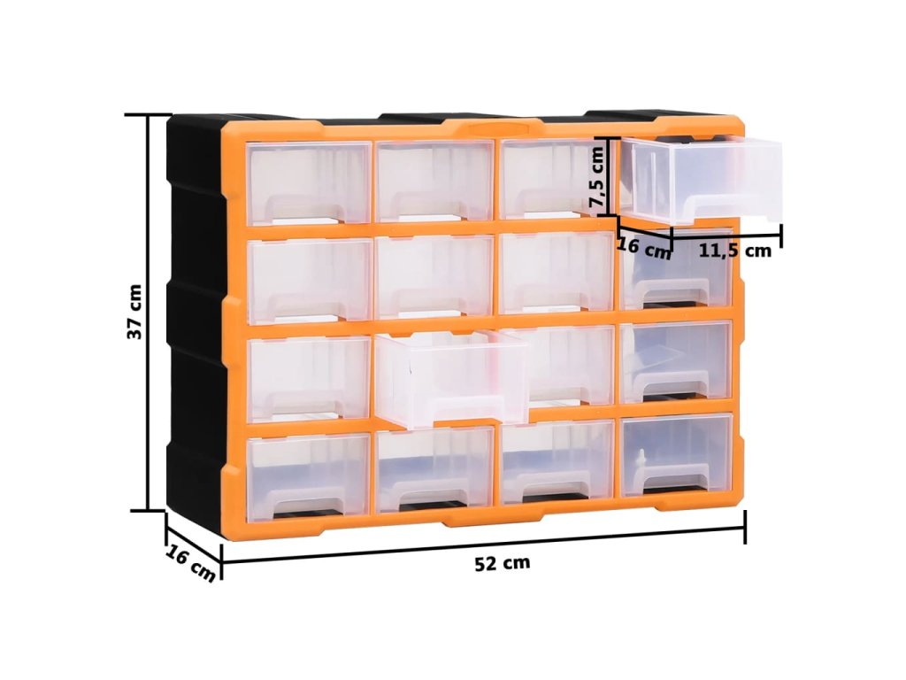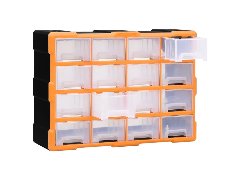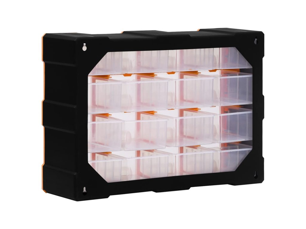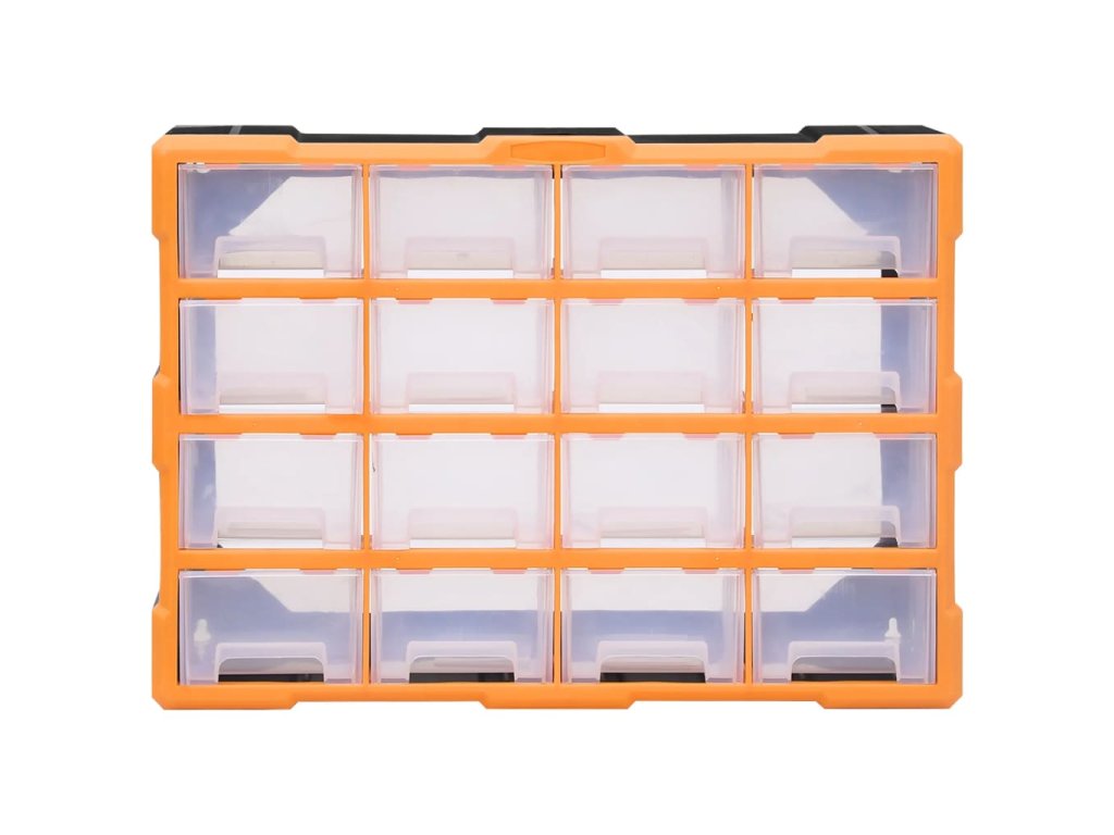 Úložná jednotka obsahuje 16 stredne veľkých zásuviek, do ktorých si budete môcť odložiť náradie dennej potreby a ktoré sa postarajú o to, aby bolo vaše ručné náradie a príslušenstvo, ako napríklad rôzne spojovacie prvky, vždy prehľadne uložené a poruke. Skrinka na náradie je vyrobená z nárazuvzdorného plastu, ktorý je trvácny a stabilný. Zásuvky sú vyrobené z priehľadného plastu, a tak hneď uvidíte, čo je vo vnútri. Box poskytuje ideálne miesto na odkladanie matíc, skrutiek, klincov, úchytov a rôznych iných súčiastok.