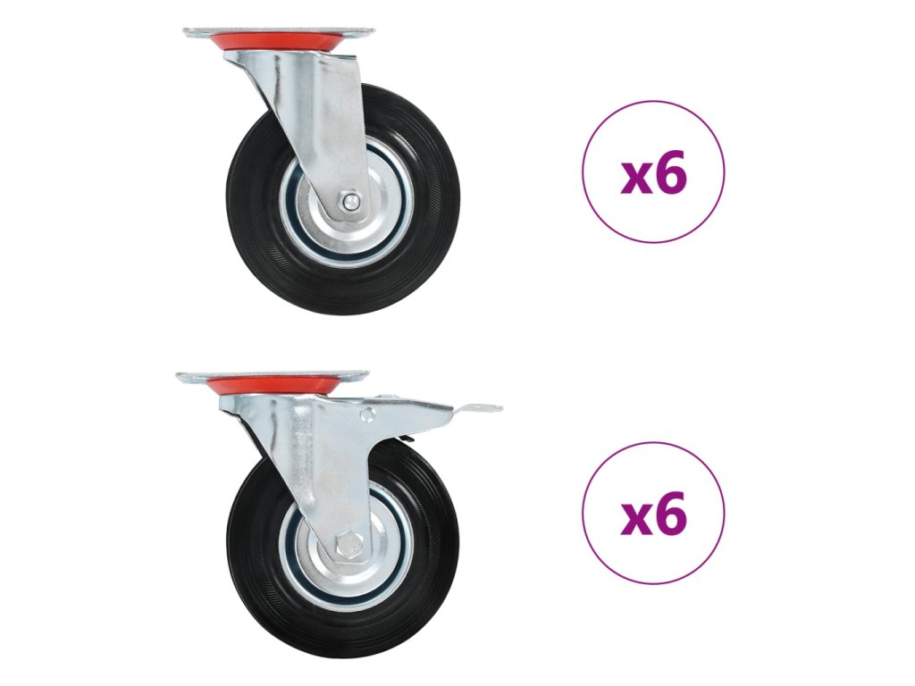 - V balení sa nachádza 6 otočných koliesok a 6 otočných koliesok s brzdou