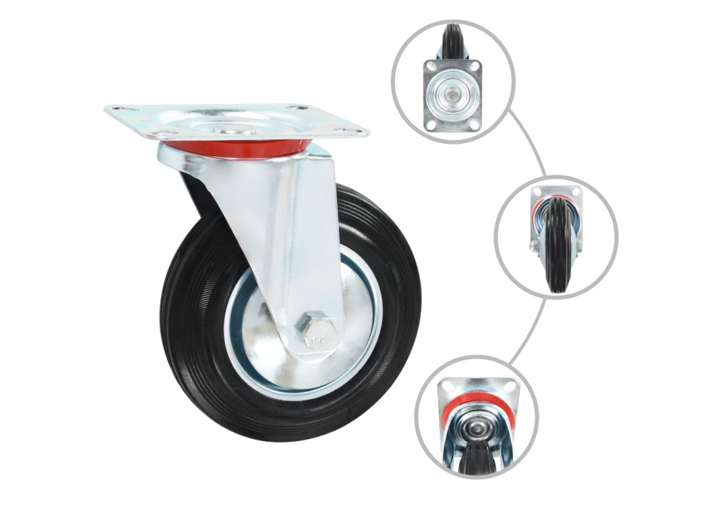 Tieto kolieska sú vyrobené z gumy, ktorá sa vyznačuje dobrou odolnosťou proti nárazom a vibráciám, čo umožňuje plynulý a tichý chod týchto koliesok. Ich mäkké povrchy navyše účinne chránia vašu podlahu pred poškriabaním. Okrem toho je železný rám z pozinkovaného plechu vysoko odolný proti hrdzi, a tým zvyšuje trvanlivosť a odolnosť kolieska. Každé koliesko má maximálnu nosnosť až 150 kg.