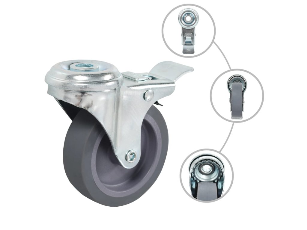 Kolieska sú vyrobené z TPR (termoplastickej gumy), ktorá sa vyznačuje dobrou odolnosťou voči nárazom a vibráciám, vďaka čomu sa kolieska budú pohybovať plynule a ticho. Kolieska majú mäkký povrch, aby nepoškrabali podlahu. Pozinkovaný železný rám je mimoriadne odolný voči korózii a kolieskam dodáva potrebnú pevnosť a trvácnosť. Otočné kolieska sú vybavené brzdami pre flexibilnejšie ovládanie. Každé koliesko má maximálnu nosnosť 45 kg.