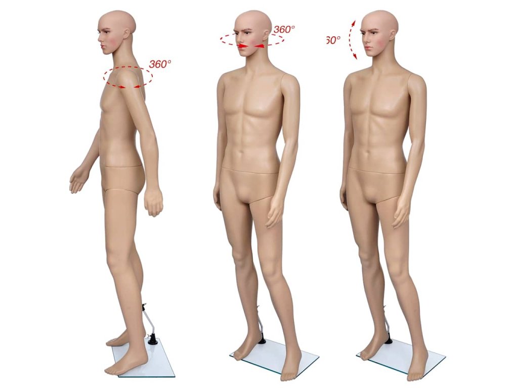 Táto pánska figurína je vhodná na vystavovanie oblečenia, parochní, módnych doplnkov a topánok vo výkladoch.