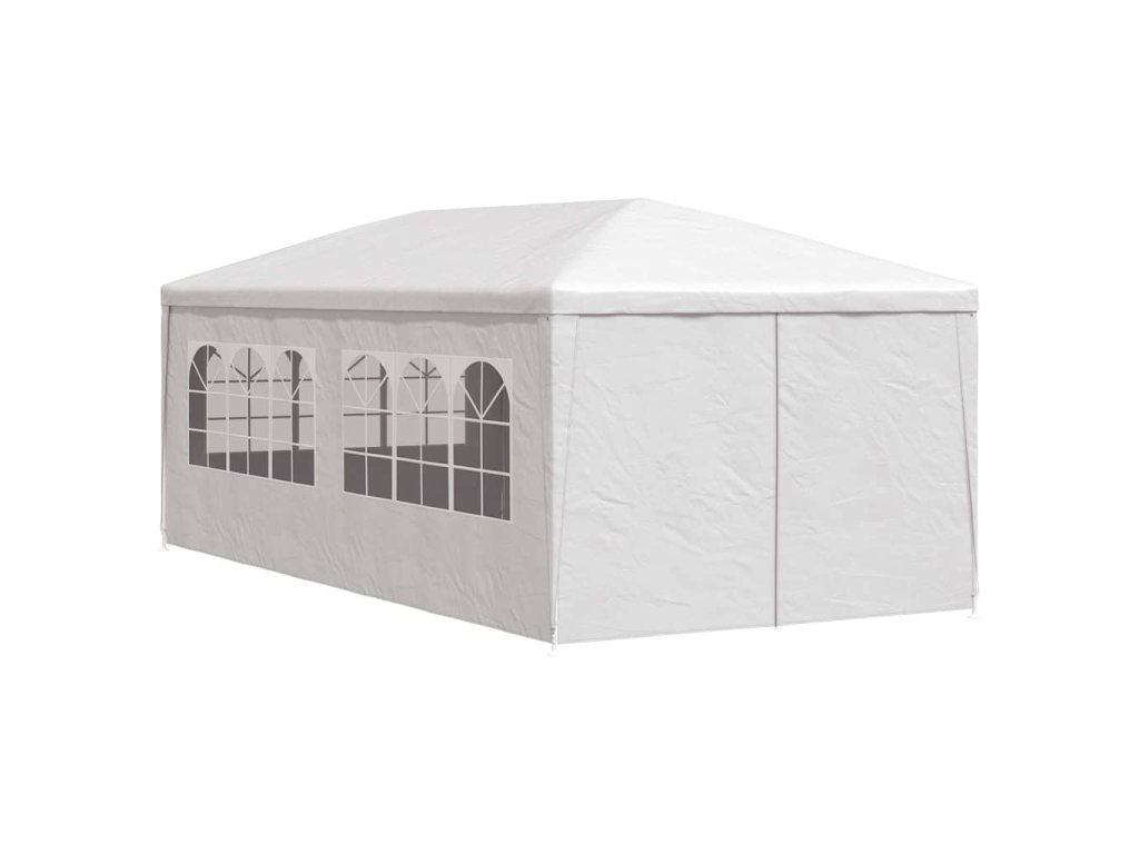 Záhradný stan je vyrobený z polyetylénového materiálu, ktorý je vodovzdorný a odolný voči UV žiareniu, a preto je naozaj vhodný do exteriéru. Rám je vyhotovený z ocele odolnej voči hrdzi, vďaka čomu je vonkajší prístrešok veľmi stabilný a trvácny. Párty stan má bočné panely, pričom na každom z nich sa nachádzajú dekoratívne okienka, a 1 panel s dvierkami na zips, ktorý umožňuje jednoduchý prístup dovnútra. Záhradný altánok sa jednoducho montuje.