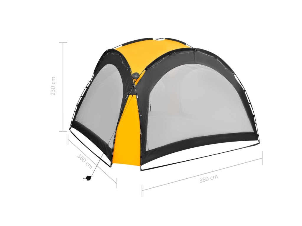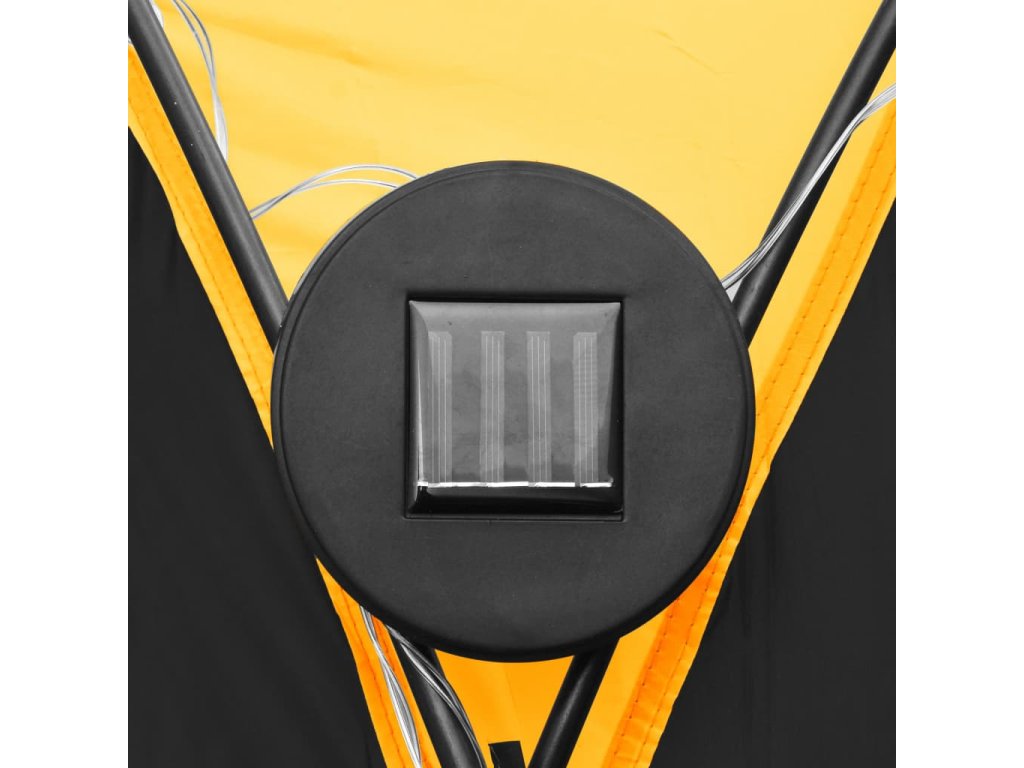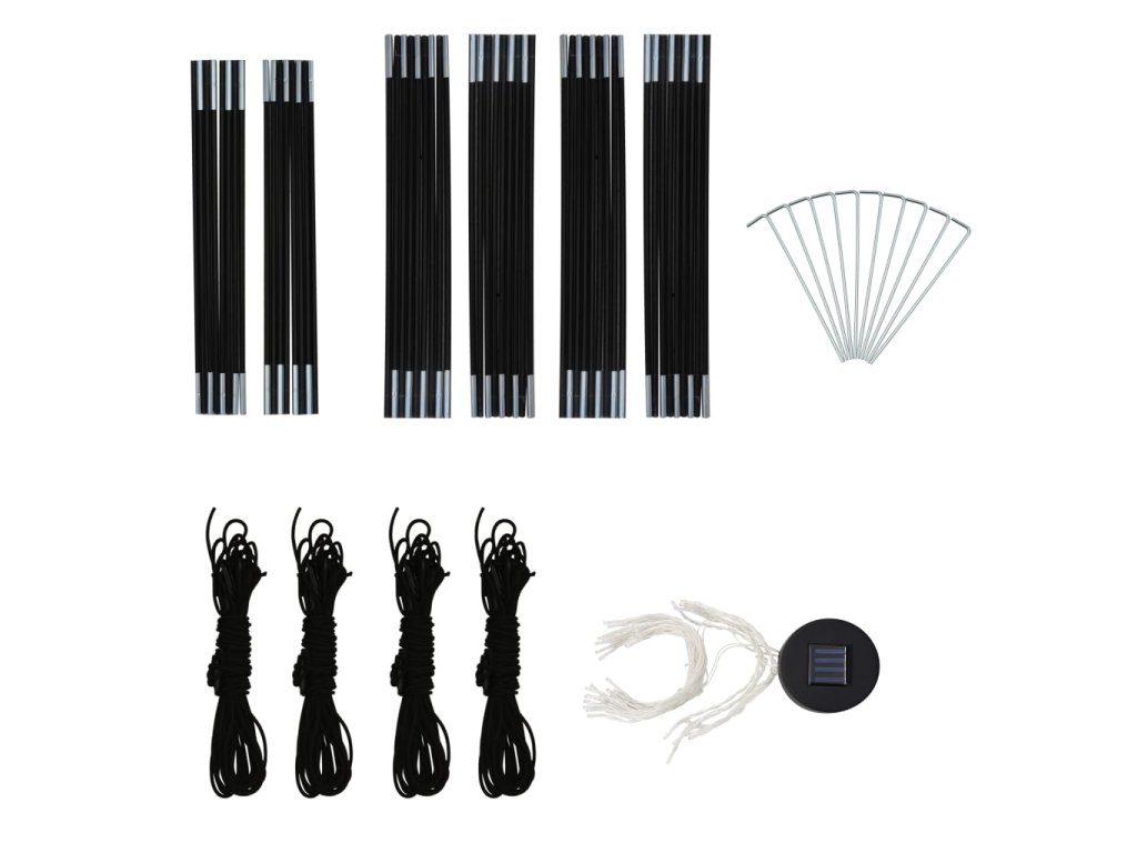 Tento párty stan je vyrobený zo 100 % polyesterovej látky s vrstvou PA, ktorá je odolná voči UV žiareniu. Rám je vyhotovený z robustného sklolaminátu, vďaka čomu je ľahký a odolný voči hrdzi. Súčasťou stanu sú aj štyri bočné steny, ktoré slúžia ako moskytiéra, a tak vám poskytnú ideálnu ochranu pred všetkými druhmi hmyzu. Majú zapínanie na zips, a tak ich pripevníte v priebehu pár sekúnd. LED svetlo s 96 LED diódami sa dá jednoducho ručne zapnúť a vypnúť. Súčasťou balenia je aj solárny modul, ktorý počas dňa nabíja zabudovanú batériu.
