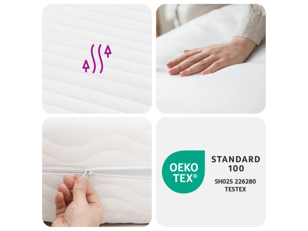 - Odolná látka: Poťah matraca je vyrobený z tkanej látky s broskyňovou úpravou, aby bol mäkký a pohodlný.