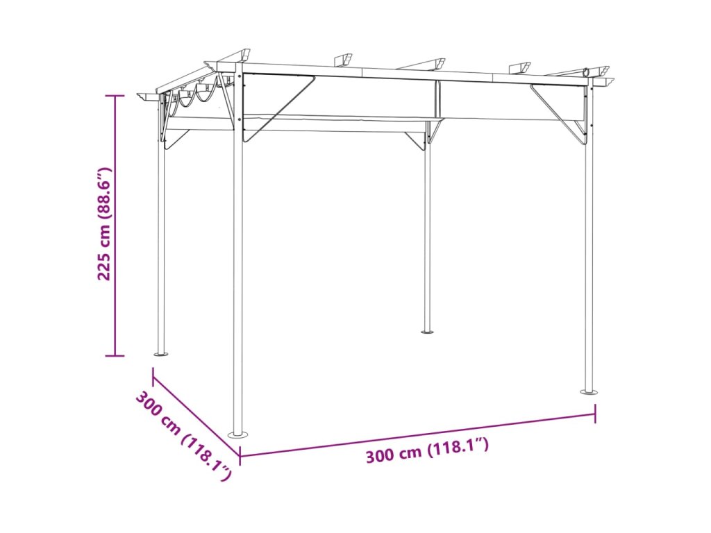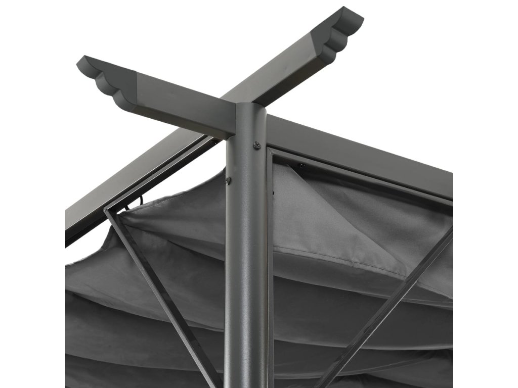 Pergola je vyrobená z ocele s práškovou povrchovou úpravou, vďaka čomu je veľmi pevná a trvácna. Strecha vyrobená z polyesterovej látky s vrstvou PA je vodovzdorná a odolná voči poveternostným vplyvom. Keď sa nepoužíva, môžete ju zložiť a očistiť alebo uskladniť. Súčasťou balenia sú aj kotviace kolíky.