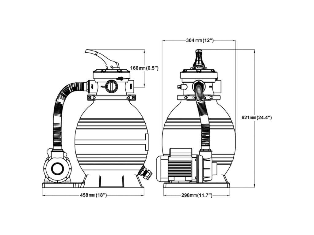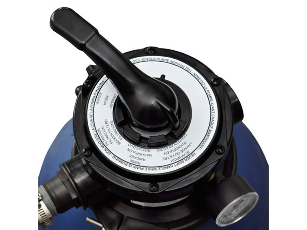 Pieskový filter dokáže prefiltrovať až 11000 litrov za hodinu. Má trvácnu filtračnú nádrž, ktorá je odolná voči korózii a voči pôsobeniu kyslej chlorovanej vody v bazéne. Jeho súčasťou je viaccestný ventil pre jednoduché ovládanie a ľahko čitateľný manometer. Konštrukcia vrchnej prírubovej svorky umožňuje rotáciu v rozsahu 360 stupňov pre bezproblémovú inštaláciu. Súčasťou sady je aj upevniteľná základňa pre bezpečné a pevné uchytenie.
